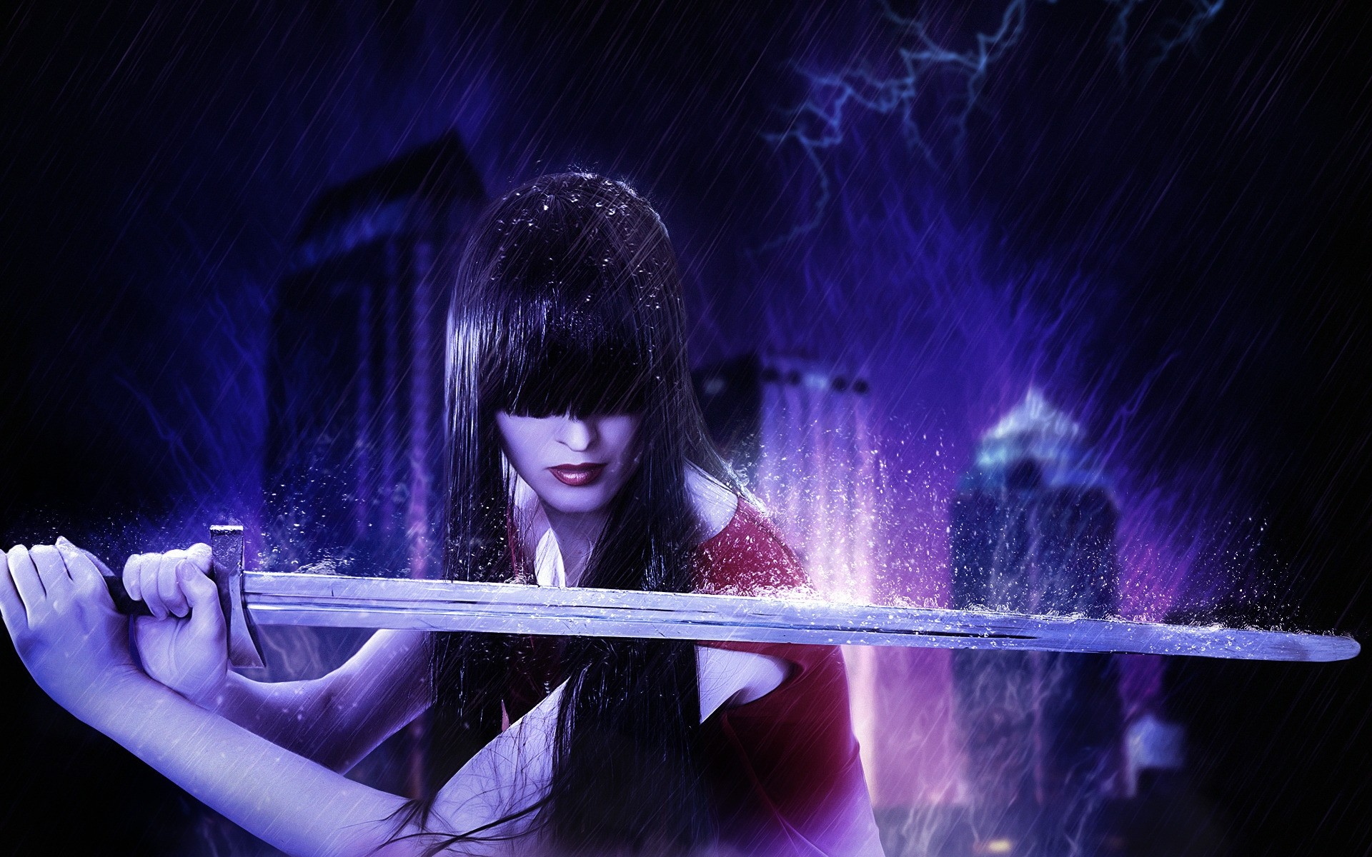 Güzel bir arka plana karşı kılıcı tutan inanılmaz bir kız - Masaüstü duvar kağıdı