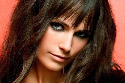 Pembe bir arka plan üzerinde bir kadının fotoğrafı