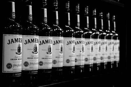 Siyah bir arka plana karşı viski şişelerinin makro fotoğrafçılığı