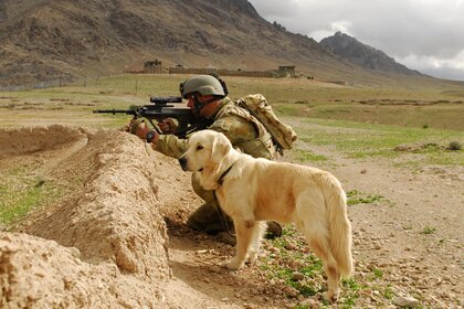 Çölde bir köpekle birlikte bir asker