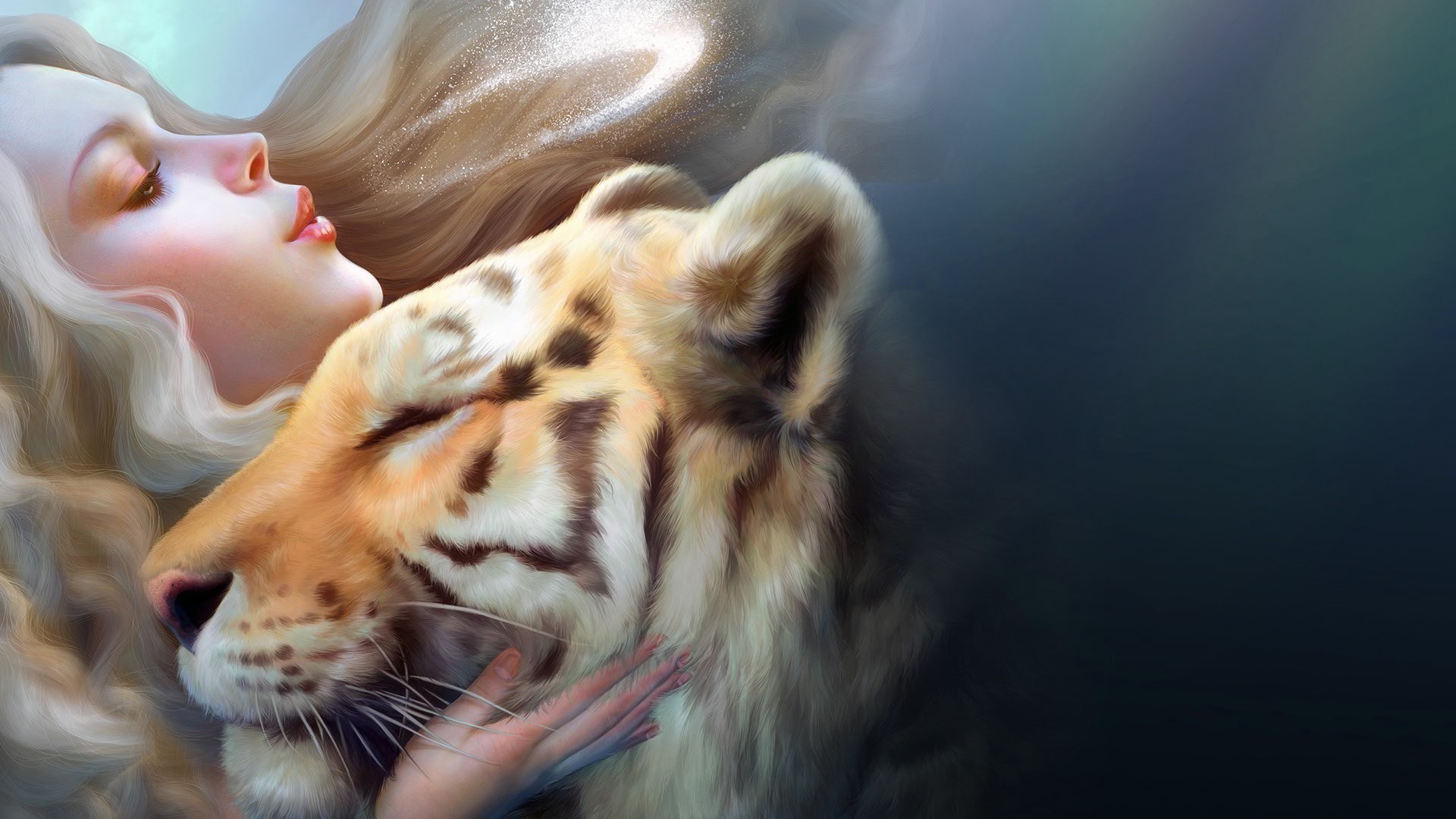 Sarışın çizgili kaplanla sarılıyor - telefona duvar kağıdı