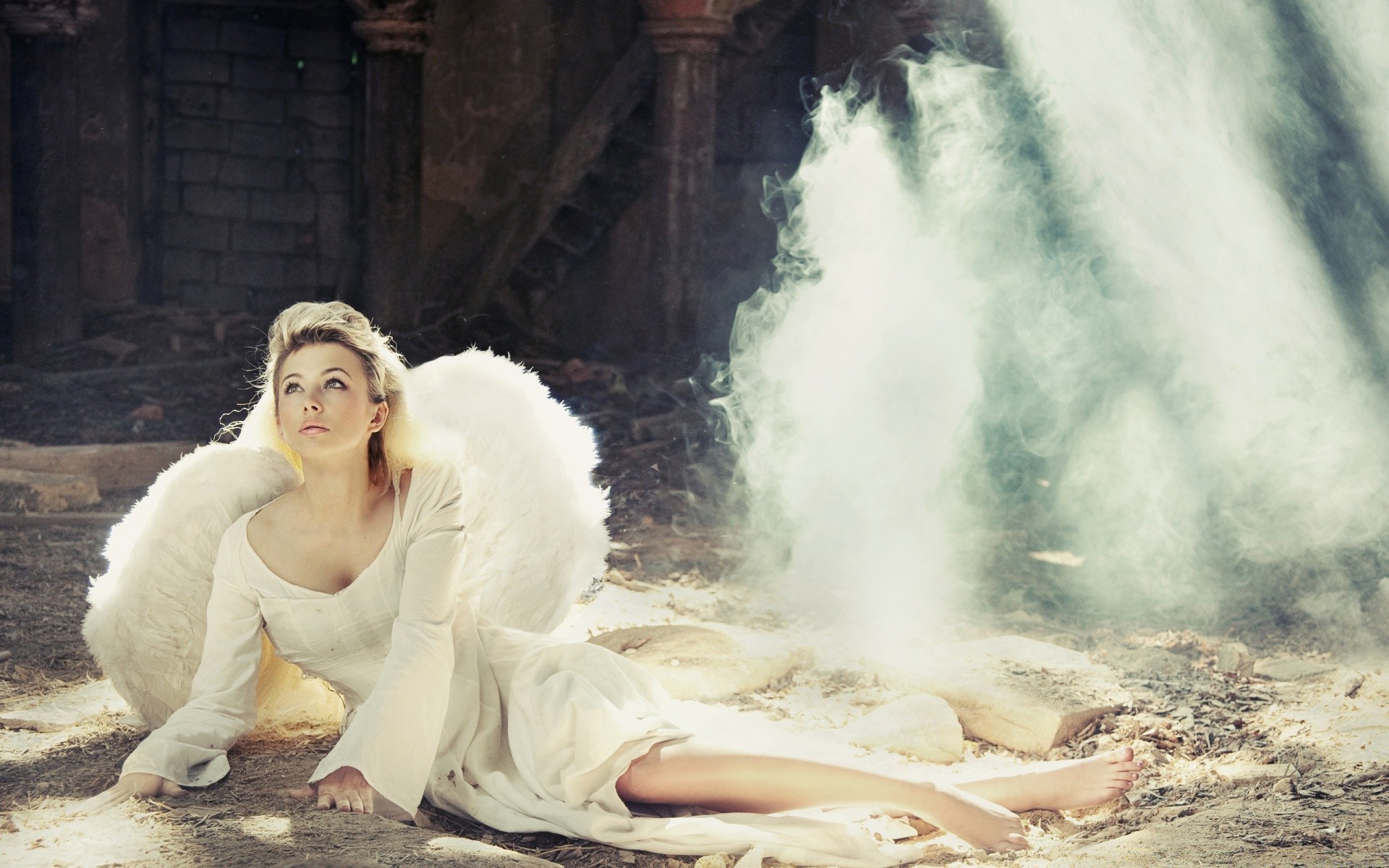 Yerde beyaz kanatlı beyaz elbiseli kız - Masaüstü duvar kağıdı