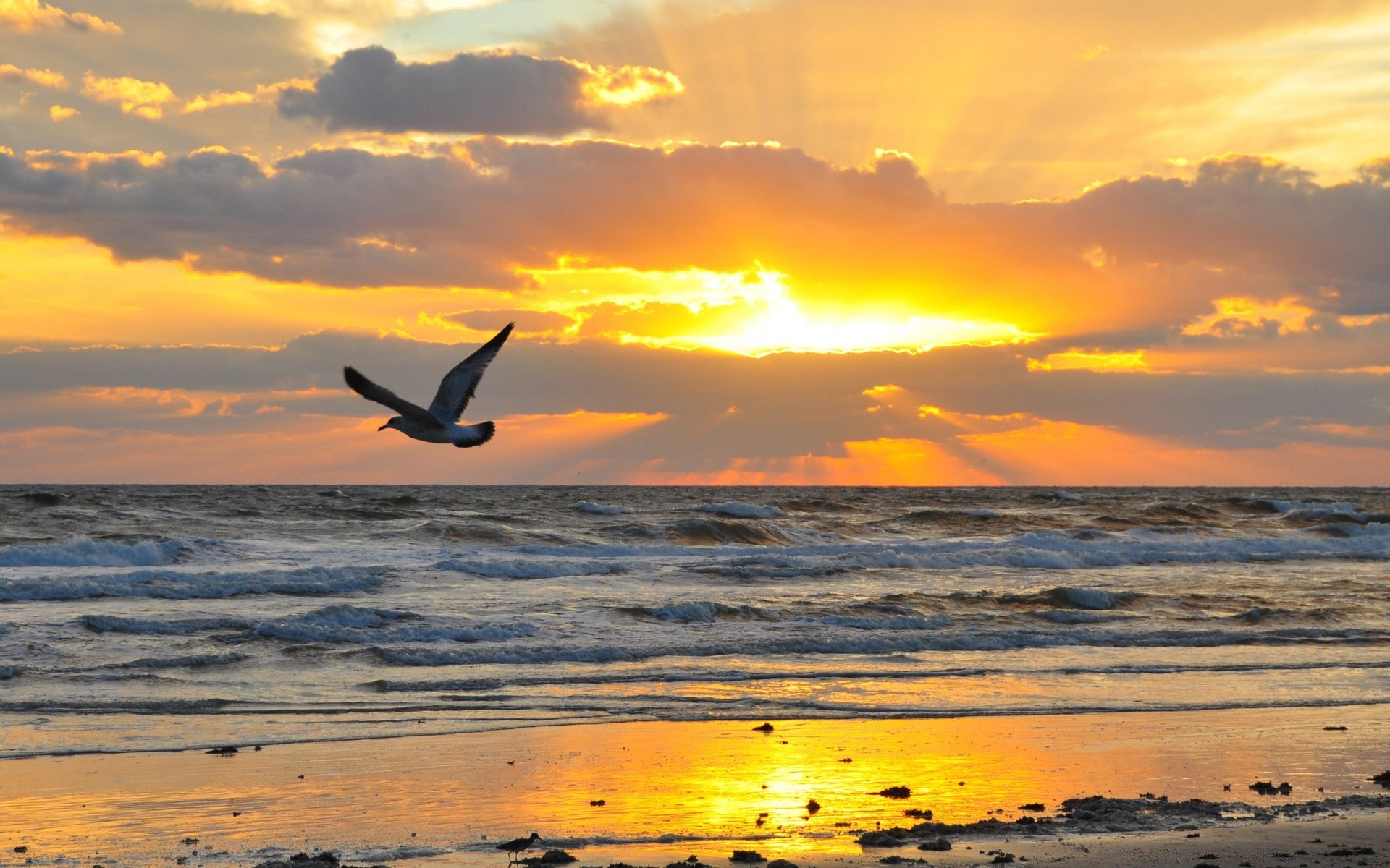 Kuş, deniz dalgalarının ve gün batımının ortasında uçuyor