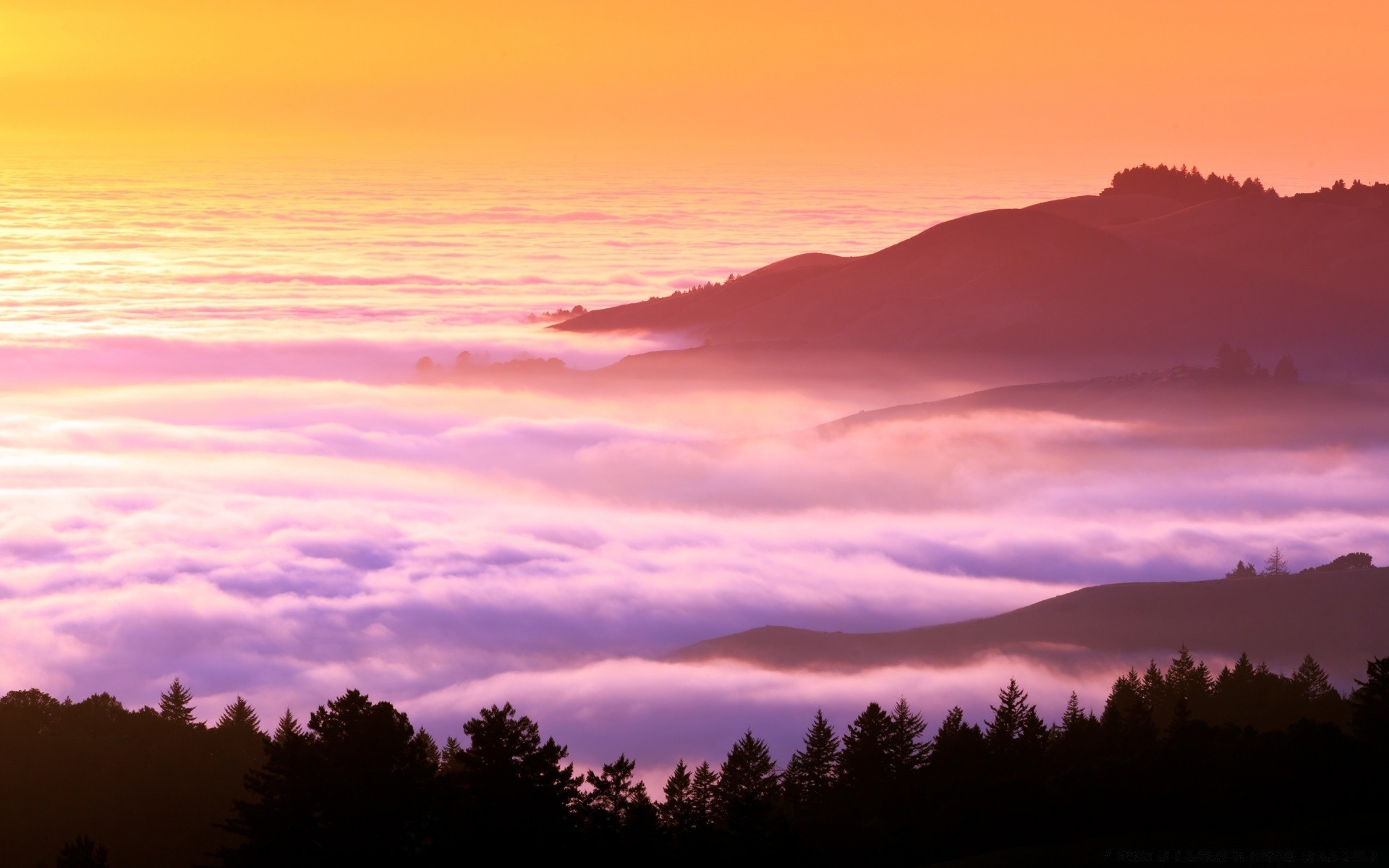 Gün batımında ormanın ve dağların üzerindeki leylak sisi