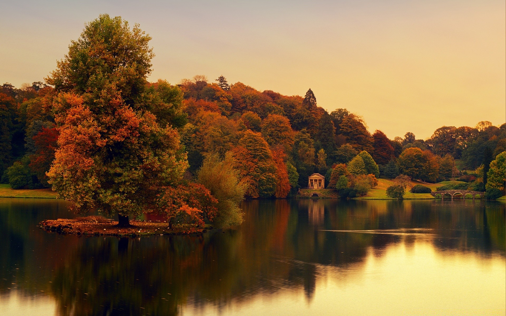 Gölün aynalı yüzeyinin üzerinde sessiz sonbahar şafağıGölün aynalı yüzeyinin üzerinde sessiz sonbahar şafağı