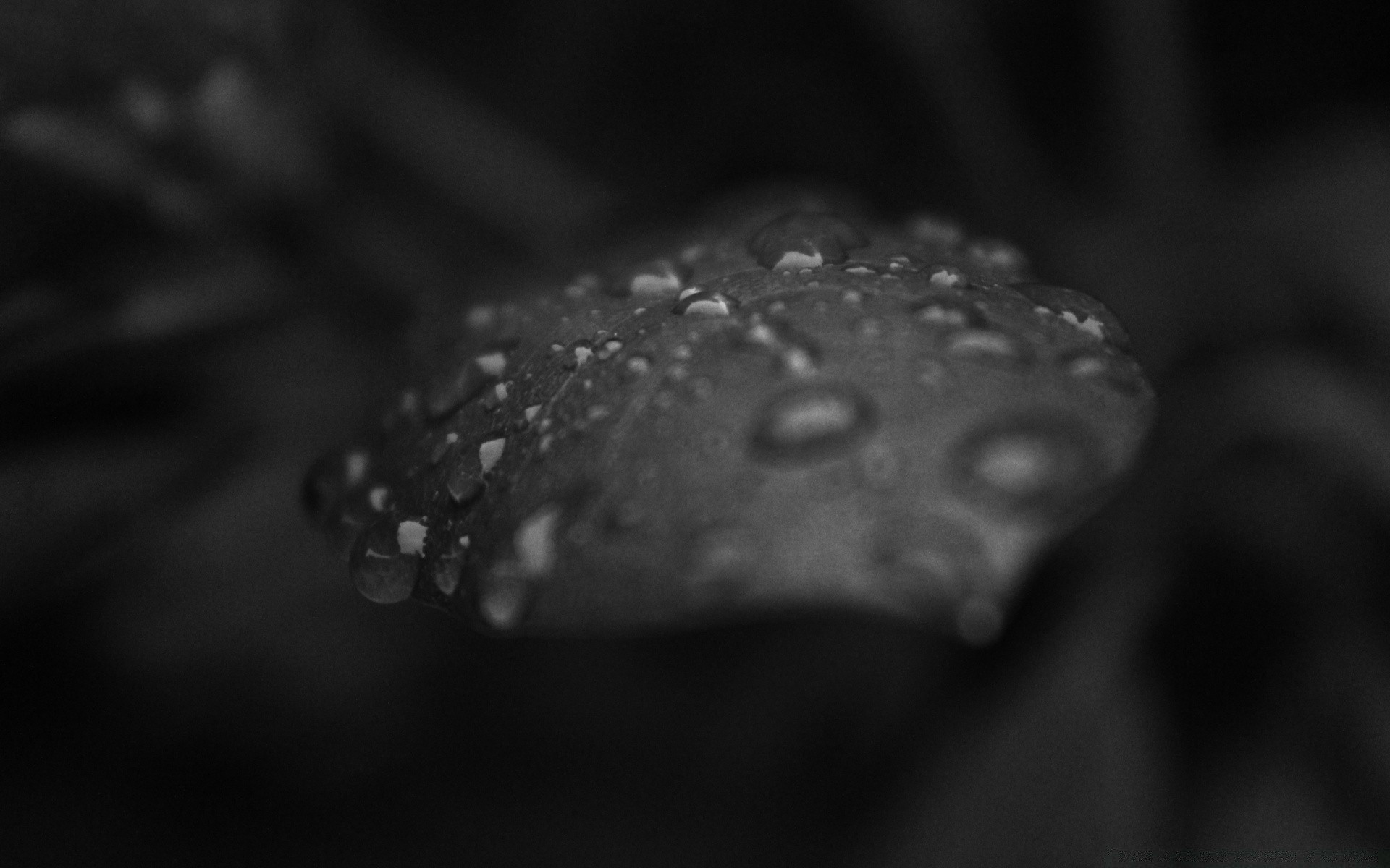 Siyah beyaz renkte bir yaprağın üzerine yağmur damlaları