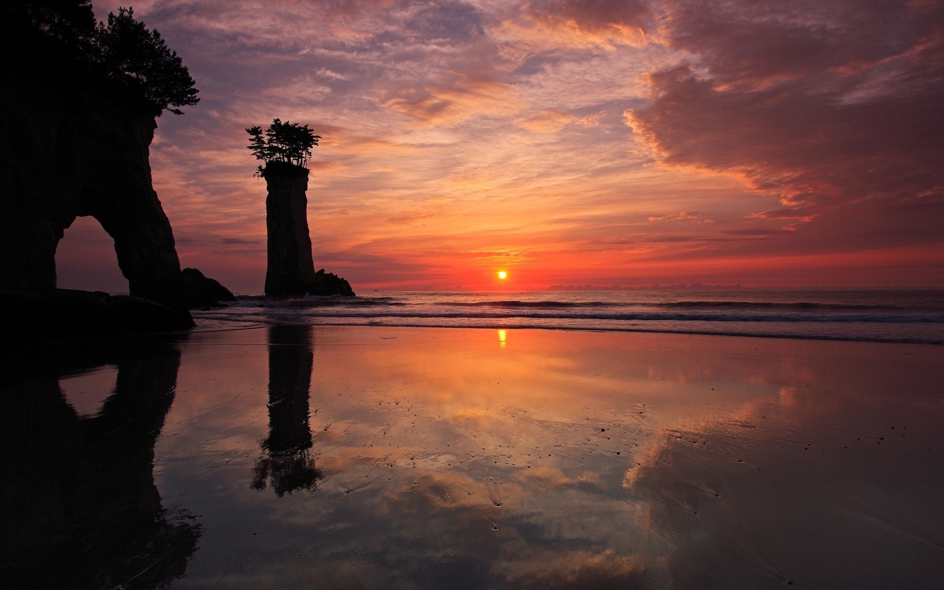 Deniz kıyısı ve gün batımı. Kıyıdaki adam