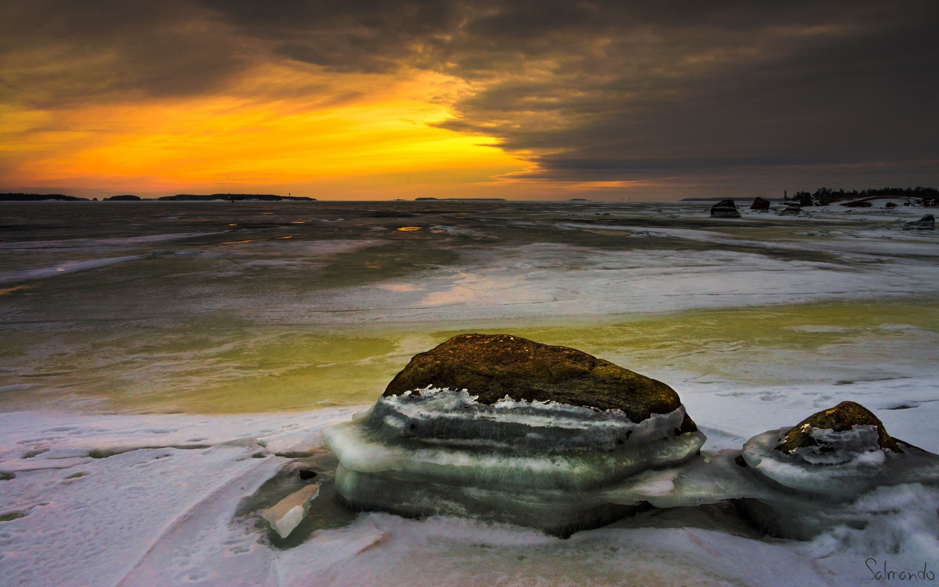 Soğuk bir deniz şafağı kıyıdaki devasa kayaları aydınlatıyor