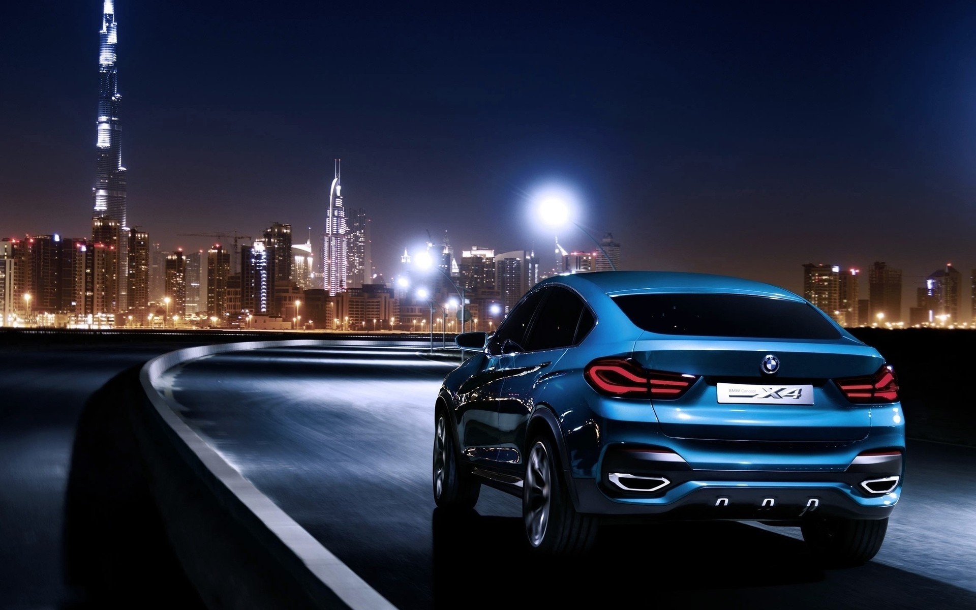 Mavi BMW arabası gece kasabasının zeminine karşı yolda ilerliyor