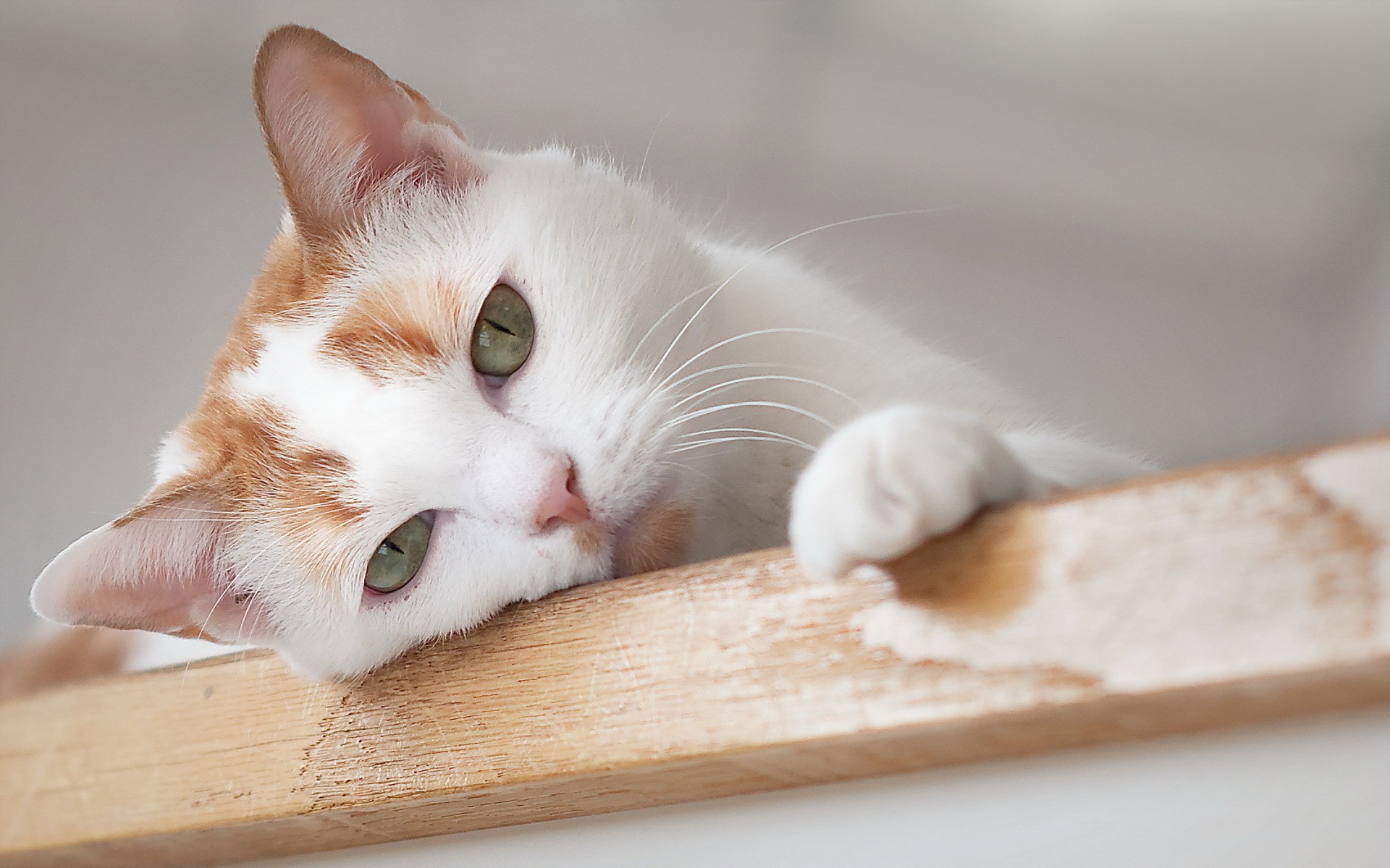 Kırmızı lekeli sevimli beyaz kedi rahatlamak için uzanıyor