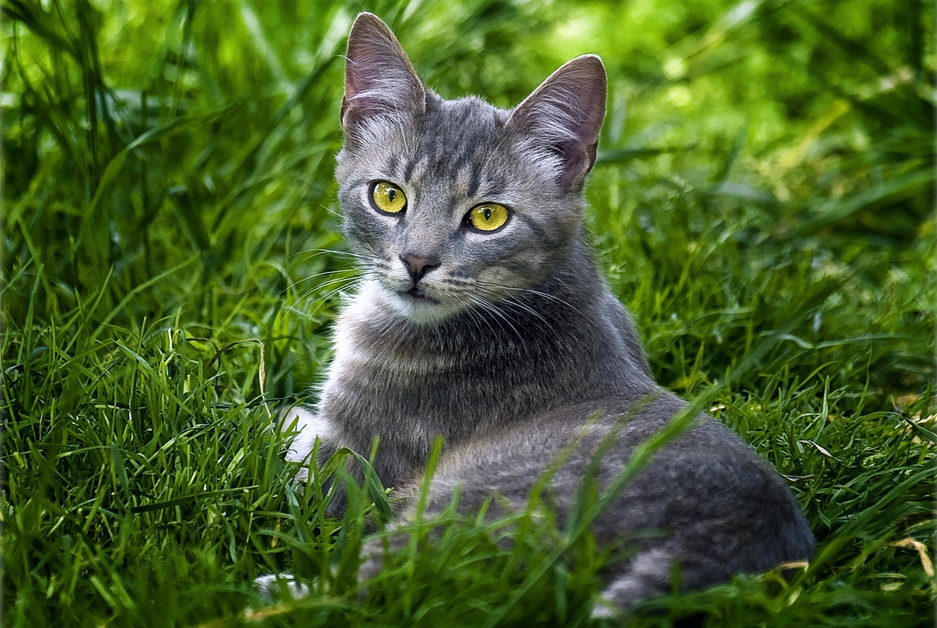 Yeşil çimenlerin üzerinde sarı gözlü kedi