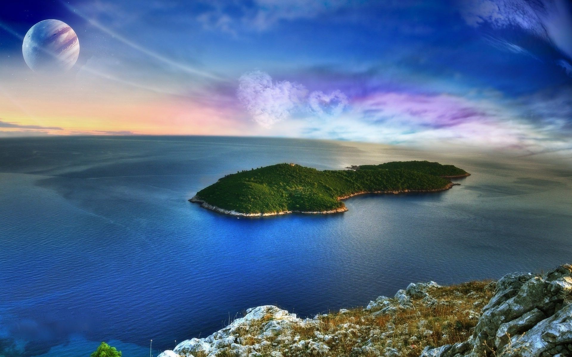 Mavi denizin ve mavi gökyüzünün ortasında bir ada