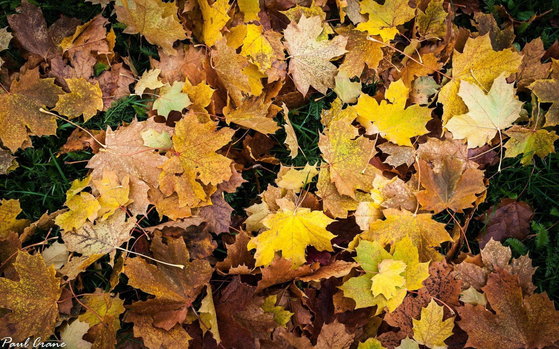 Sonbahar yaprakları çimlerin üzerinde uzanır