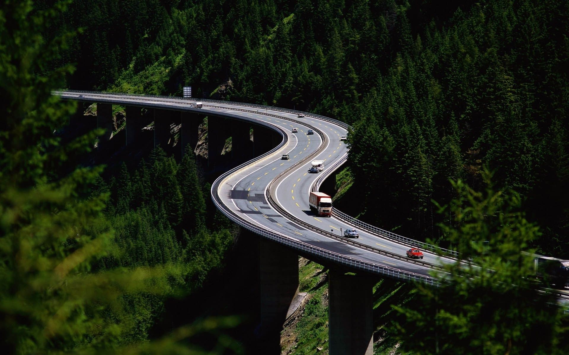 Gün batımında yeşil bitki örtüsünün ortasında yola çıkan otoyolGün batımında yeşil bitki örtüsünün ortasında yola çıkan otoyol