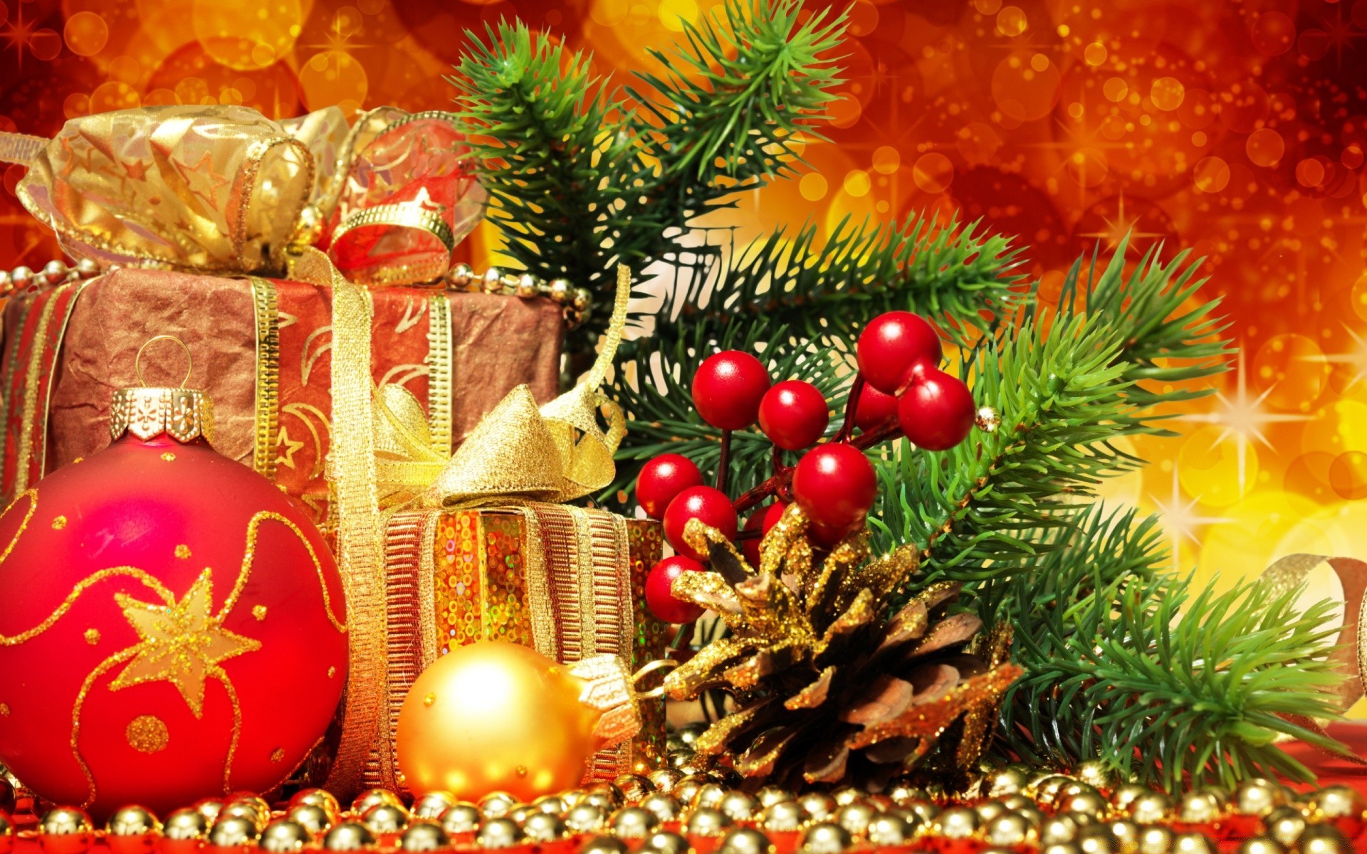 Kırmızı bir arka plan üzerinde Noel topları ve koniler