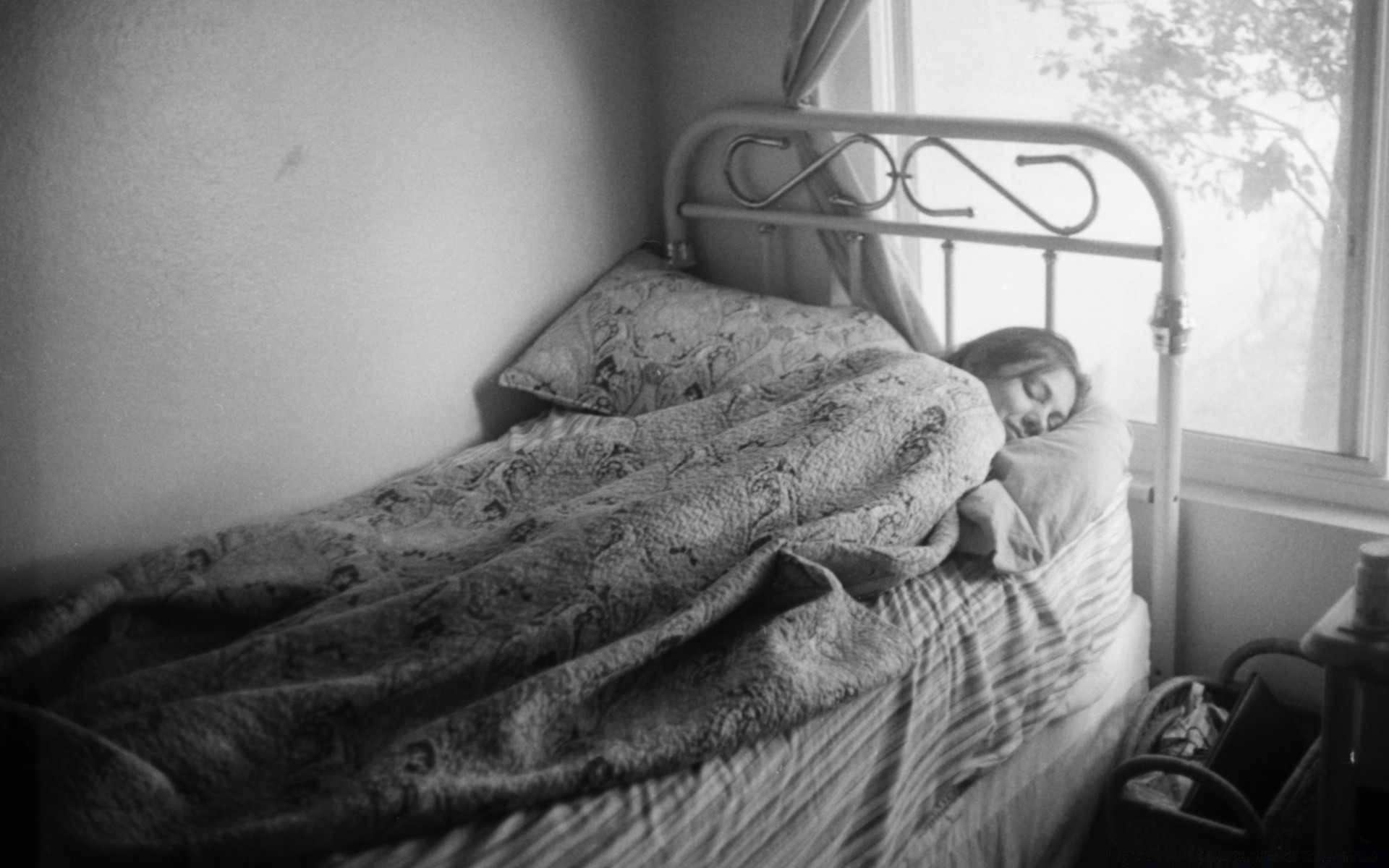 Kafasında örgülü bir tırpan ve çelenk bulunan yatakta kız