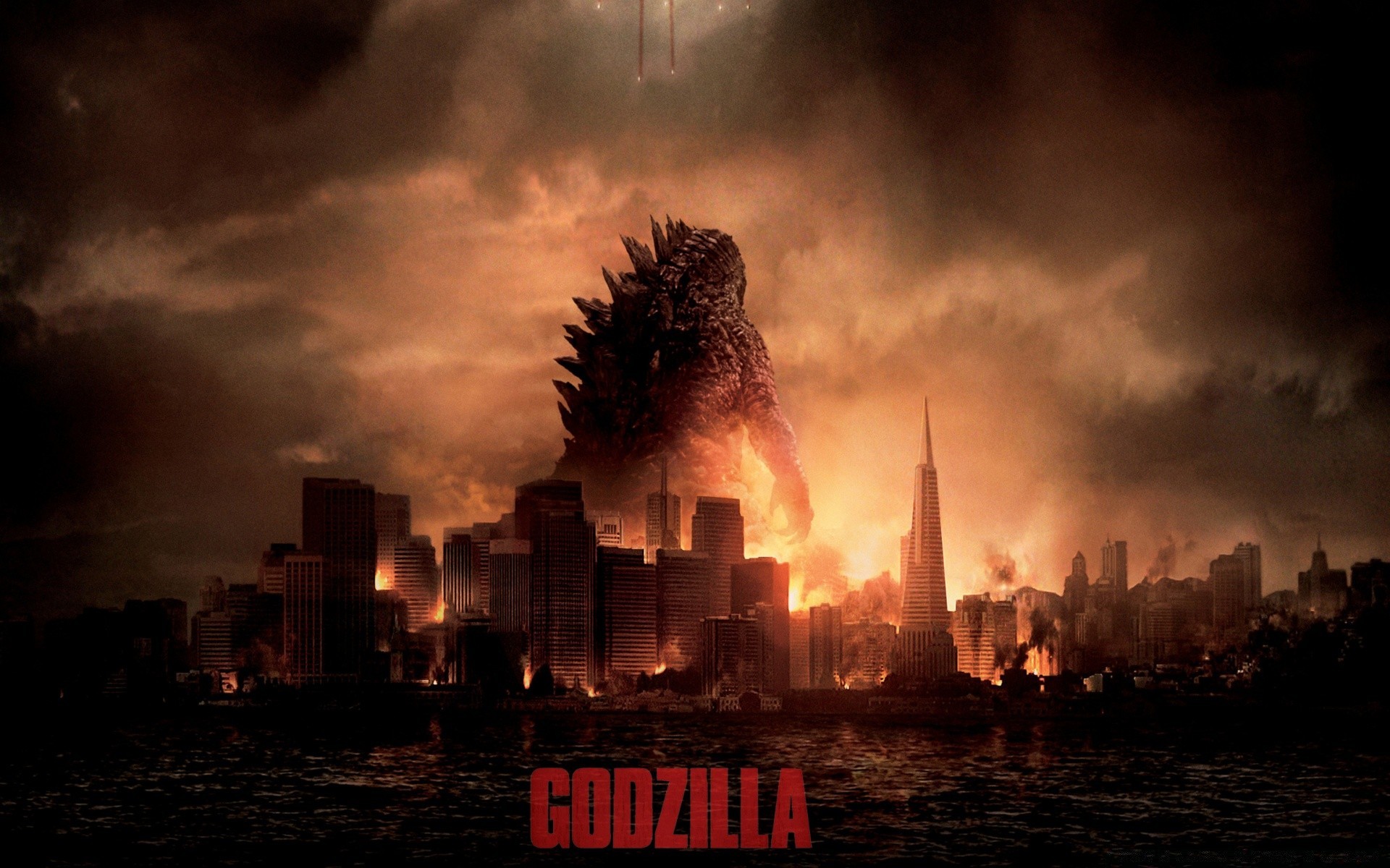 Godzilla filmindeki resim. Godzilla gün batımında şehirde