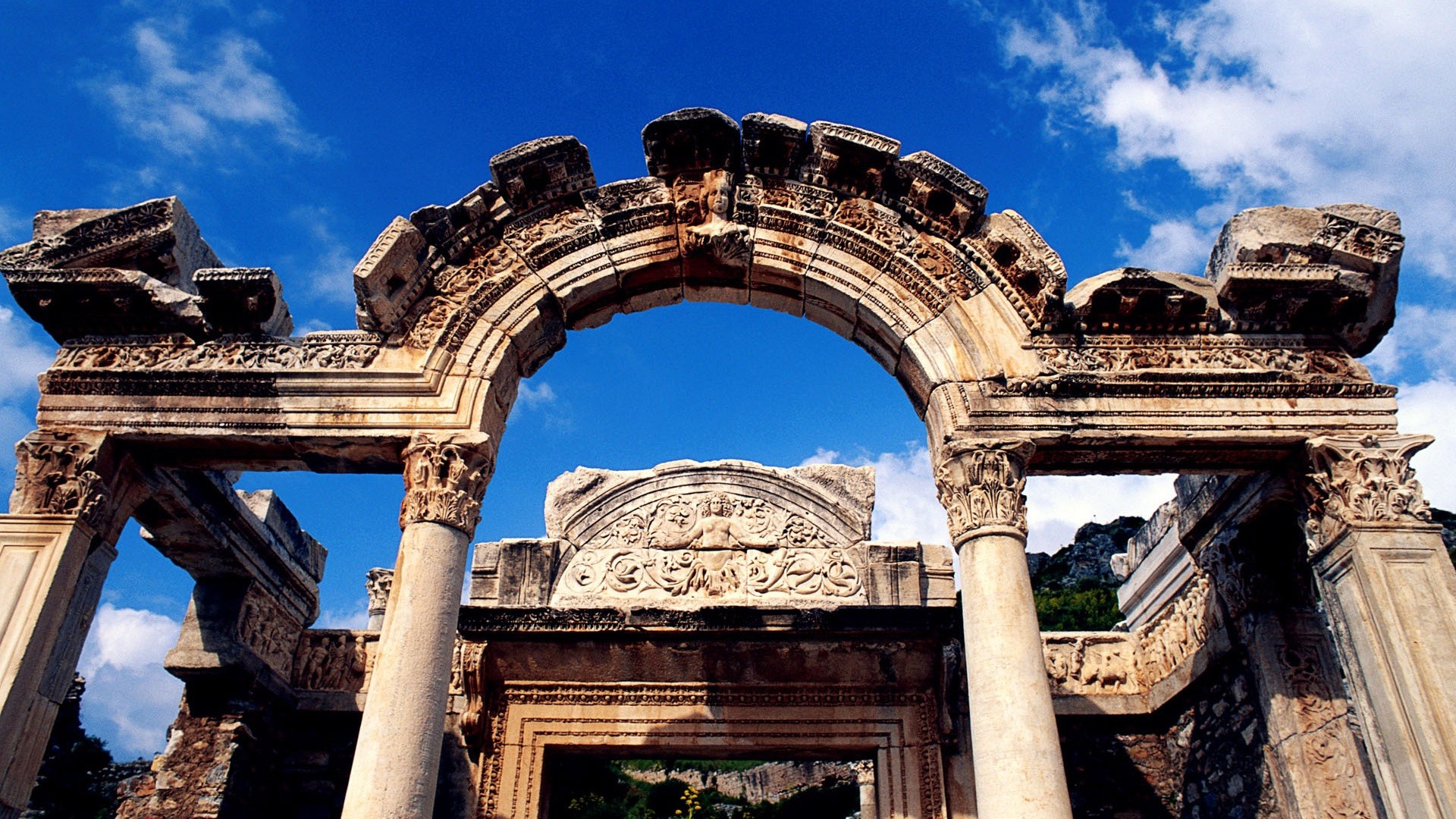 Avrupa'yı gezmek, antik yapıların ortasında gün batımı