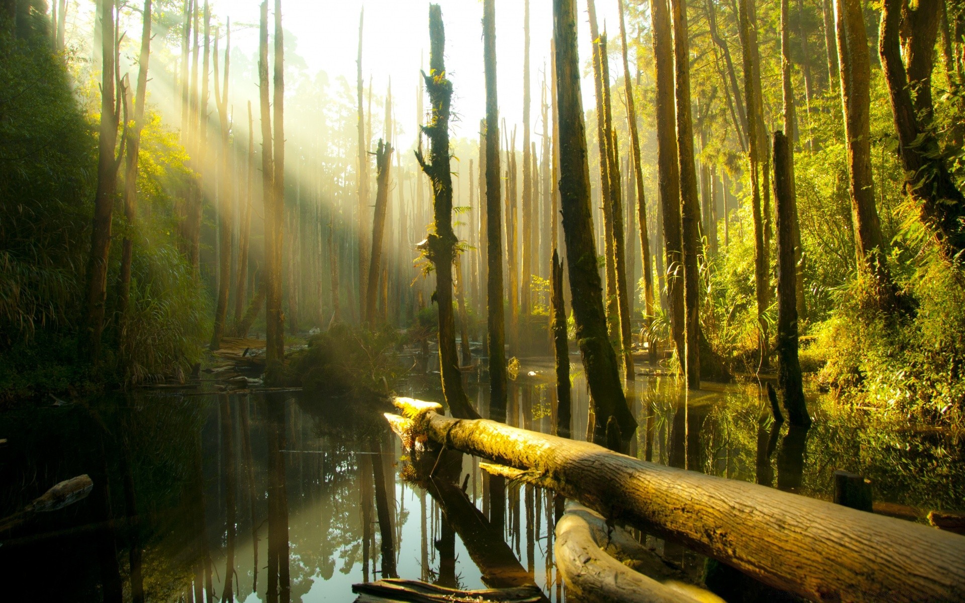 Kronlardan gelen ışınlar ormandaki bir gölü aydınlatıyor