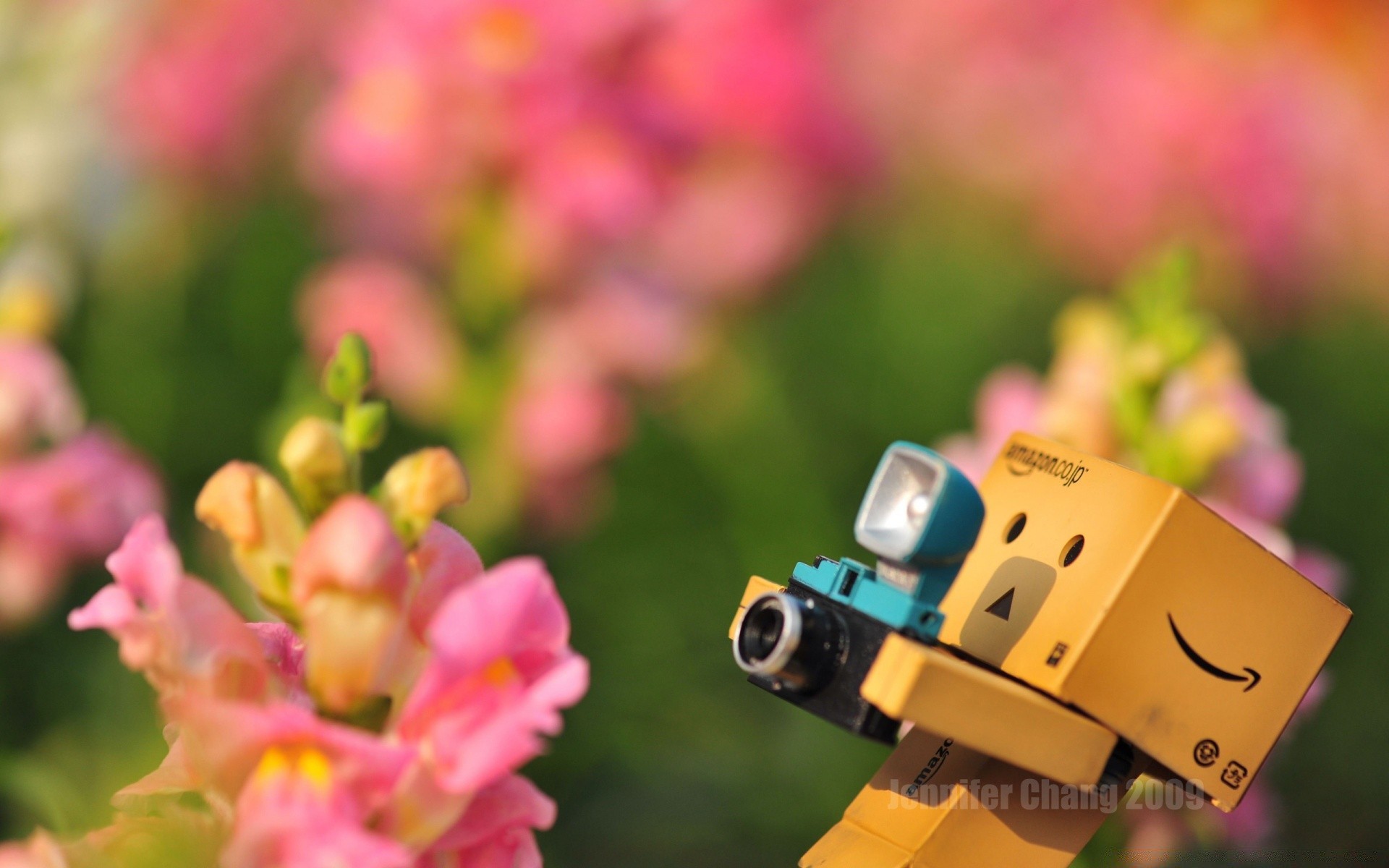 Kutulardaki küçük adam çiçeklerin fotoğraflarını çekiyor
