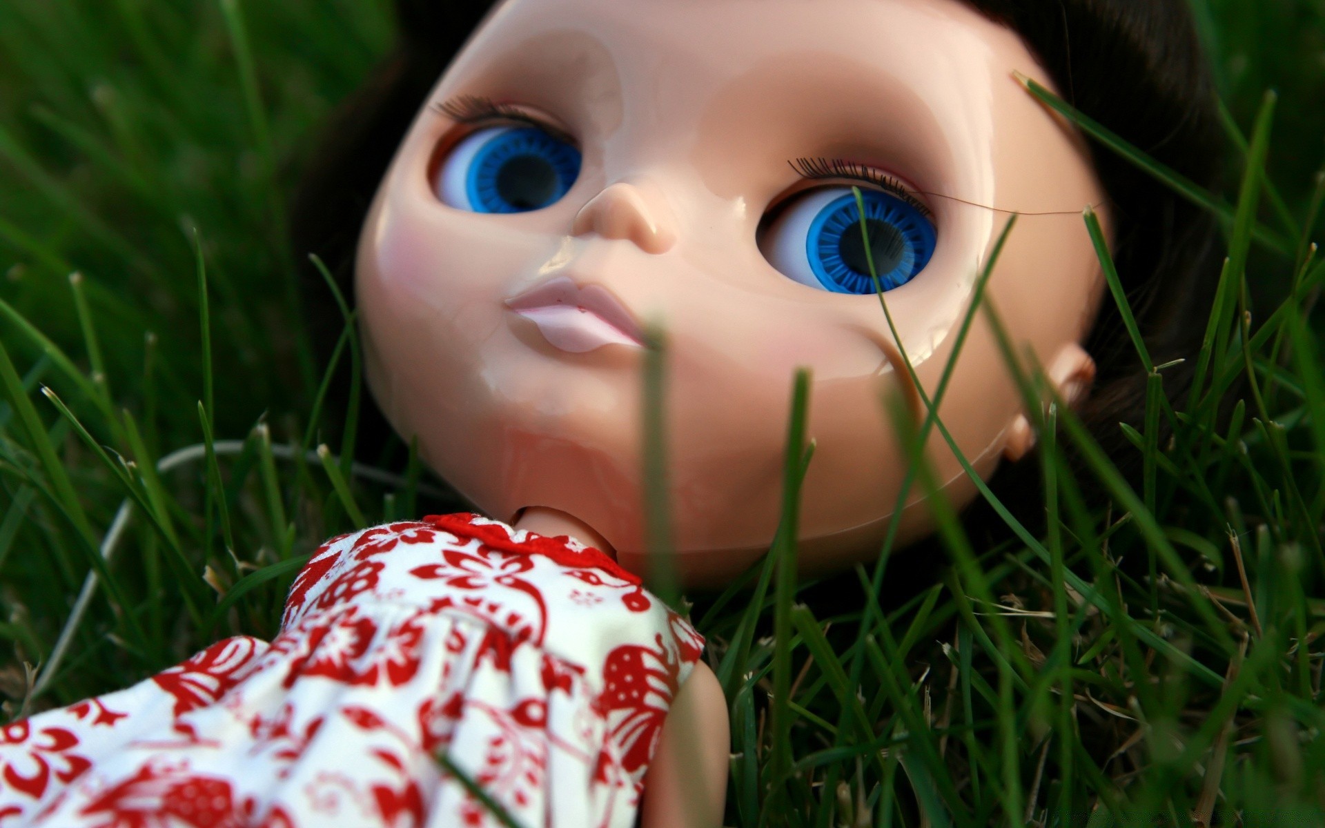 Kırmızı elbiseli bir bebek çimlerin içinde yatıyor