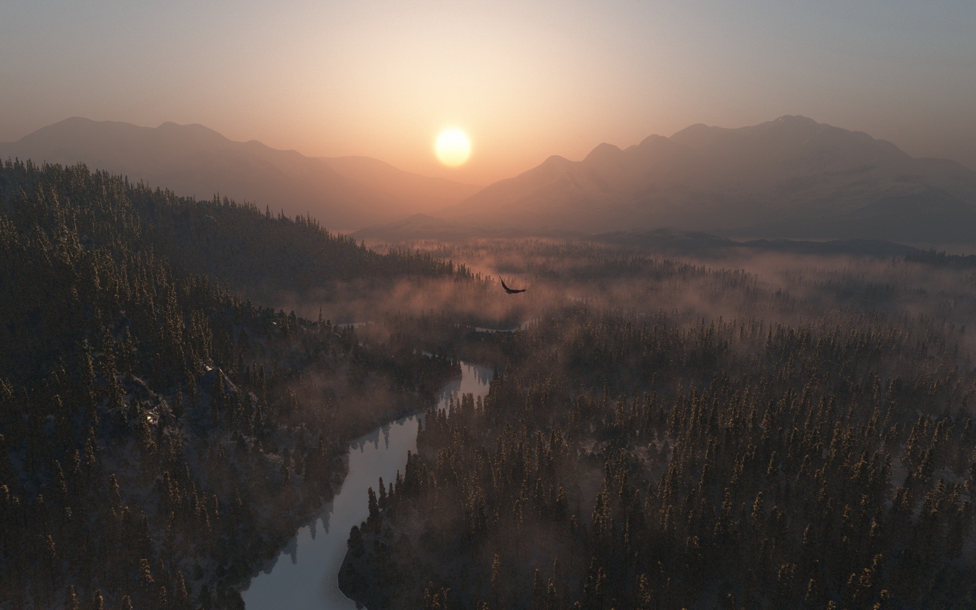 Ormanın ve dağların üzerinde şafak vakti