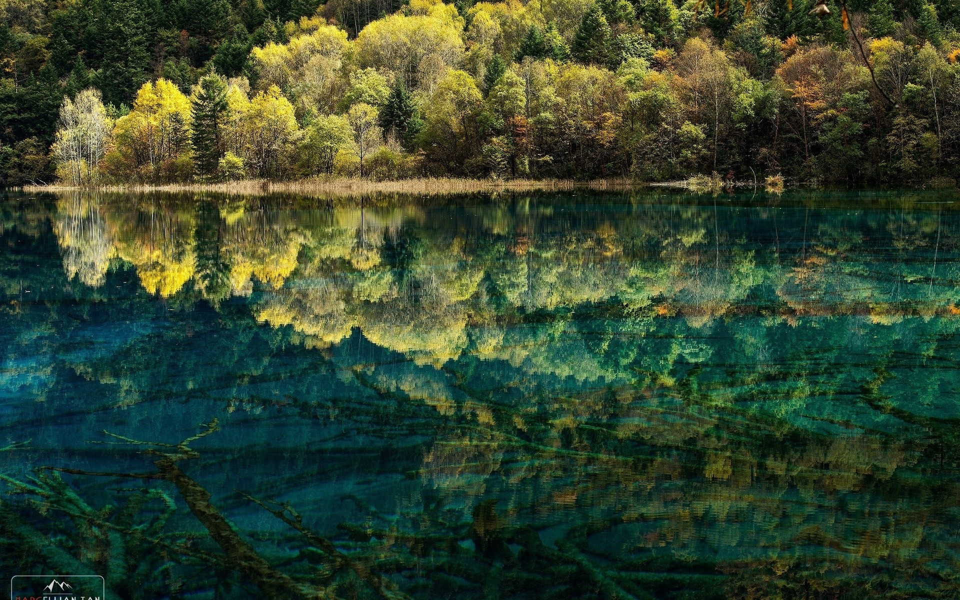 Yeşil ormanın berrak suda yansıması