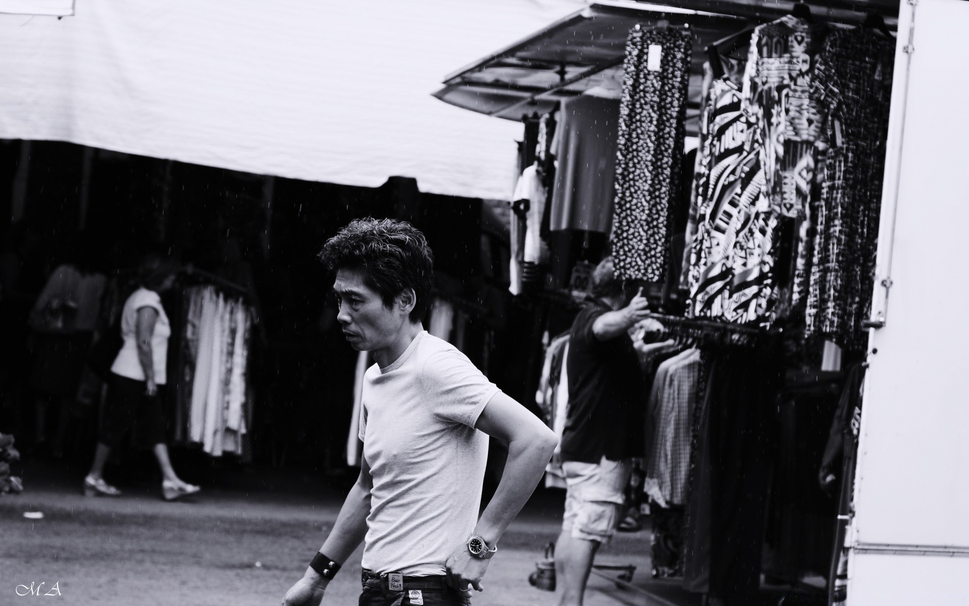 Piyasadaki bir erkeğin siyah beyaz fotoğrafı