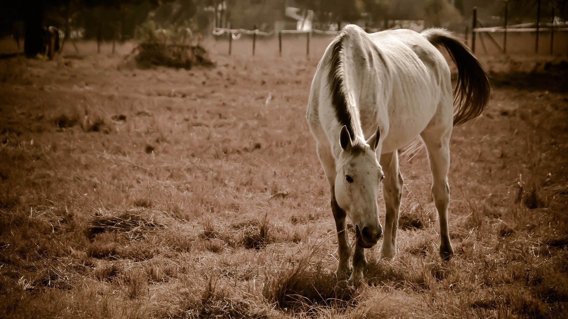 Siyah bir arka plana karşı uzun bir yeleği olan gri bir at