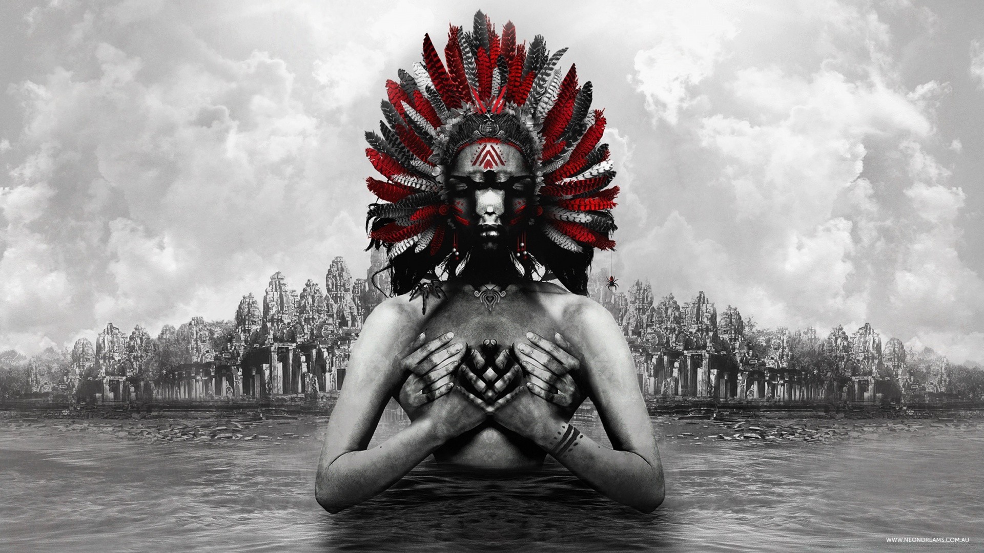 Yerli halkın ulusal kıyafetinde bir kadının siyah-beyaz fotoğrafı