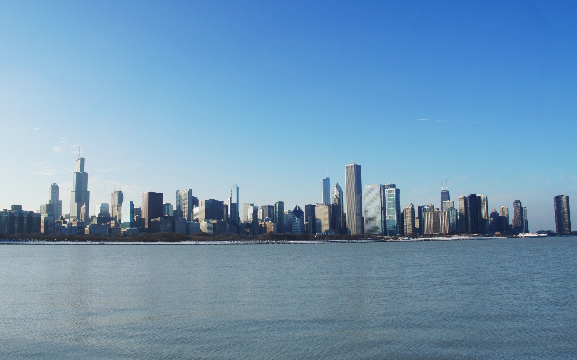 Mavi deniz ve uzaktaki gökdelenler görülebilir