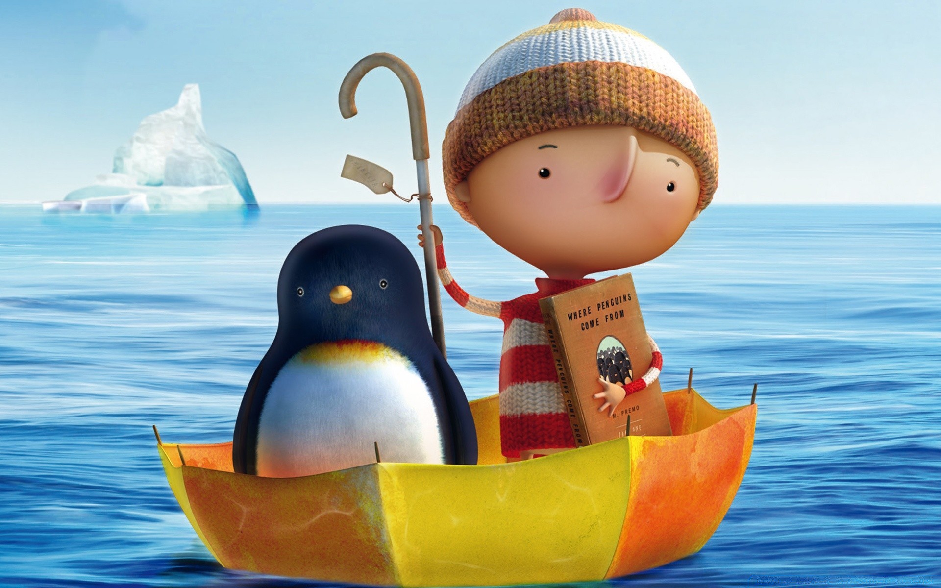 Oğlan ve penguen şemsiyede denizde yüzüyorlar