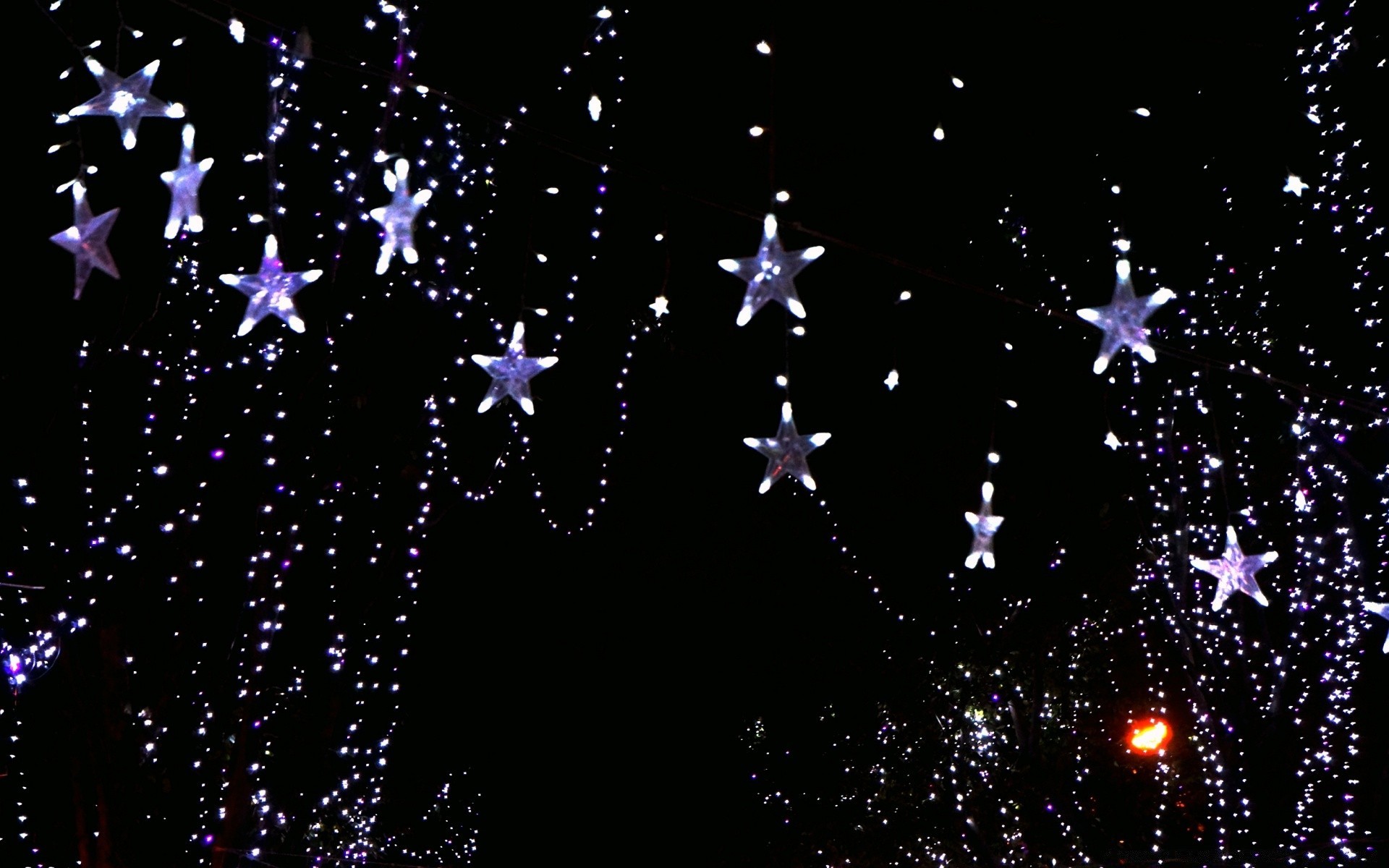 Kışın açık havada çelenkli süslenmiş Noel ağacı