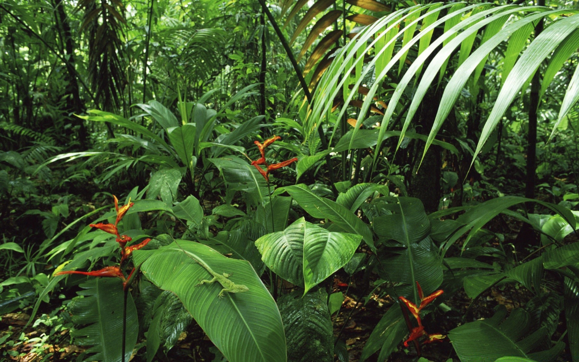Tropikal bitki örtüsü ve beyaz bulutlarla mavi gökyüzü