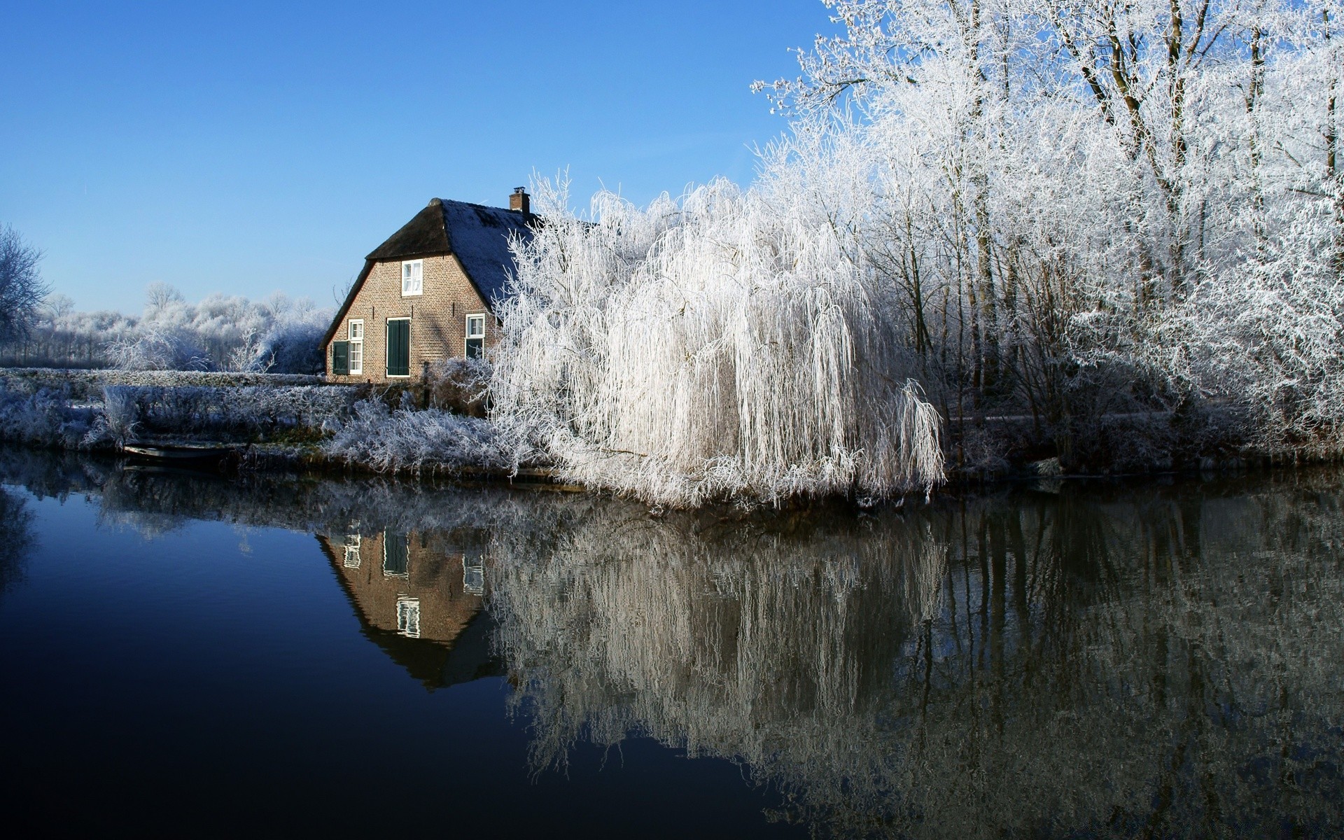 Kış aylarında karla kaplı, yukarı doğru kapanan ağaçlar