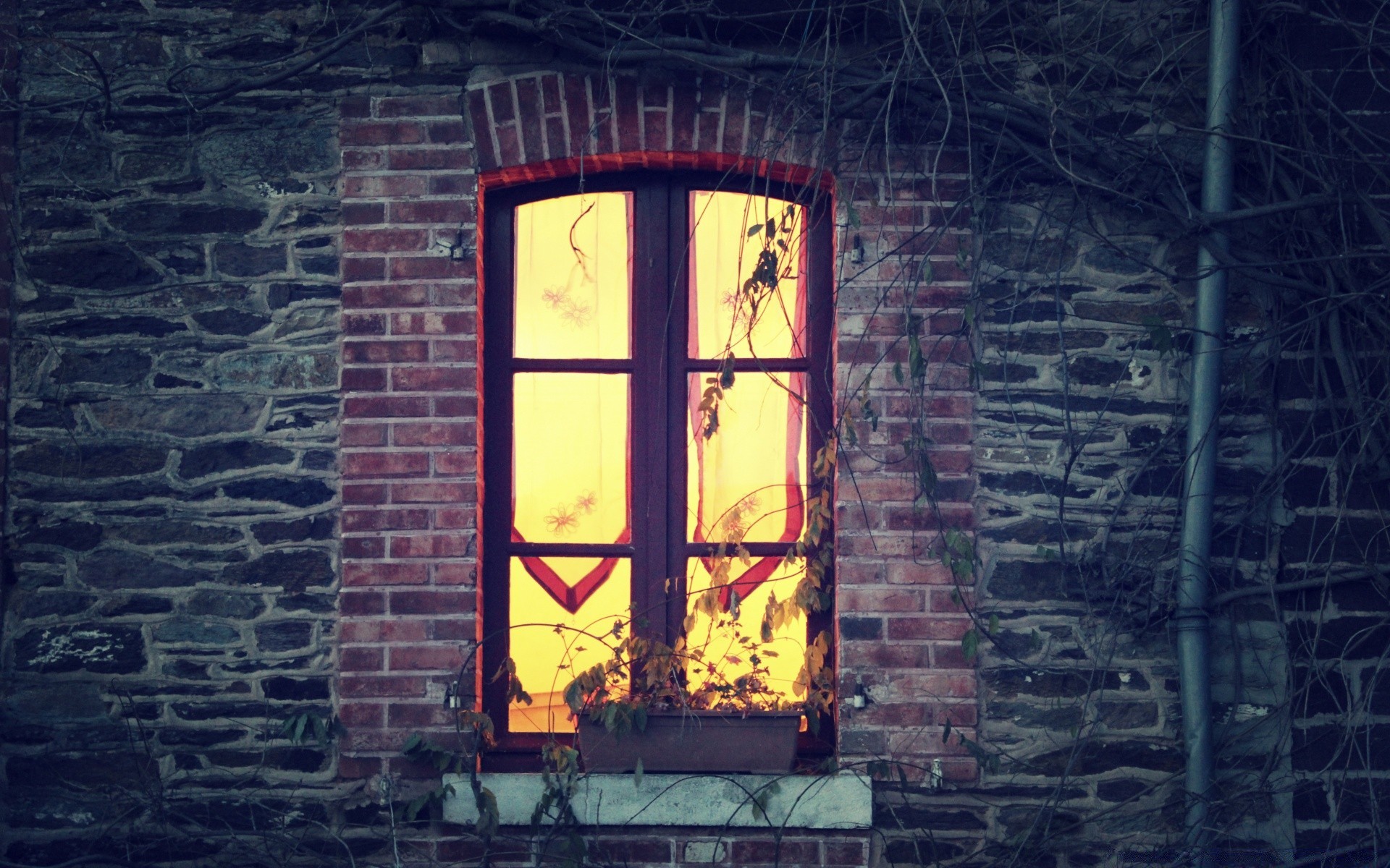 Eski bir evde perdelerin arkasındaki parlayan pencere