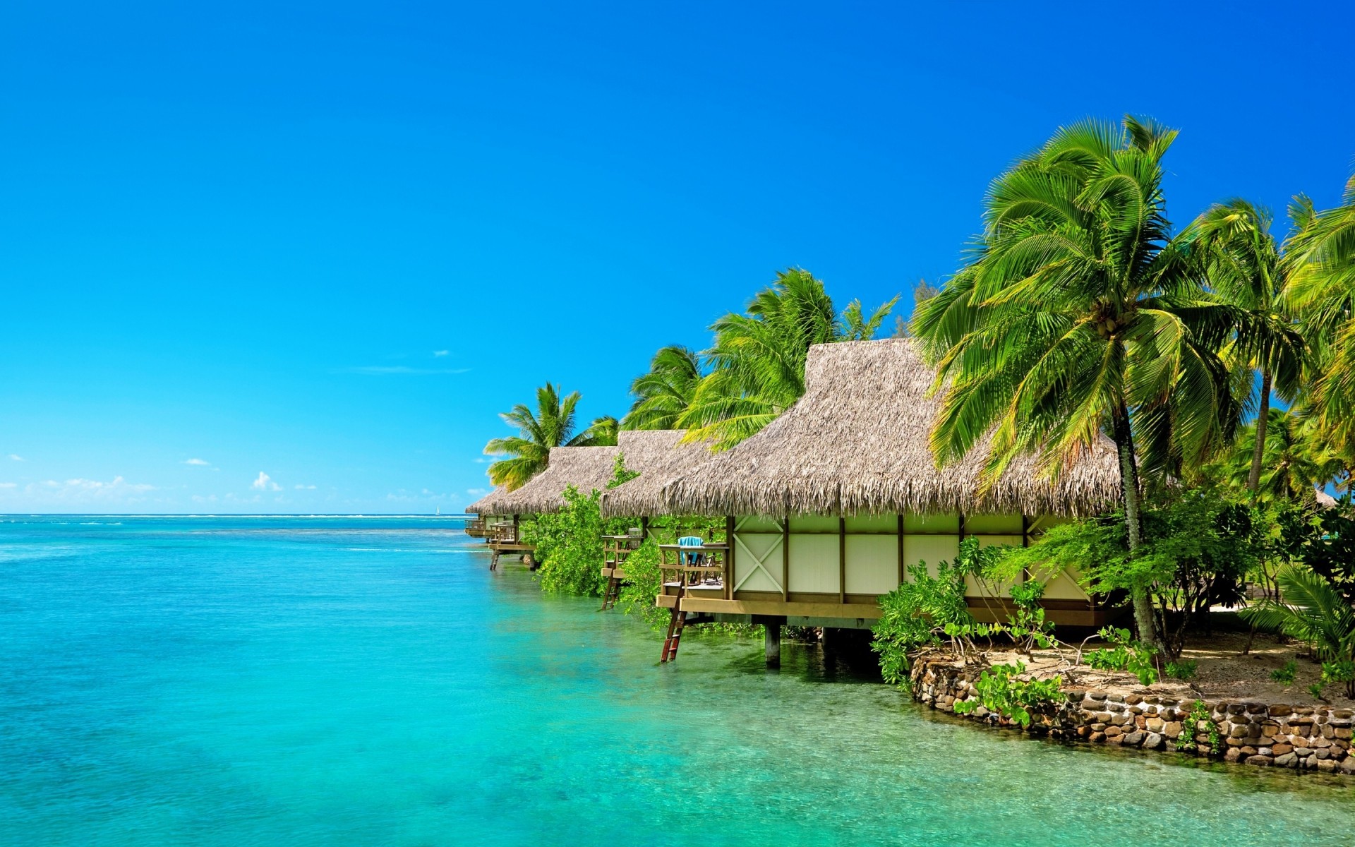 Egzotik bir adada bungalovlar ve masmavi deniz