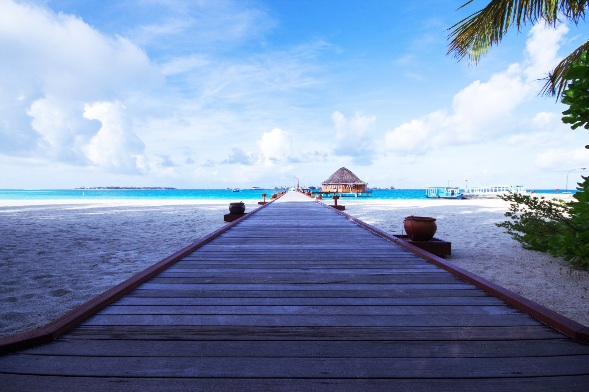 Beyaz plajların ve turkuaz suyun üzerindeki güneşli gökyüzü