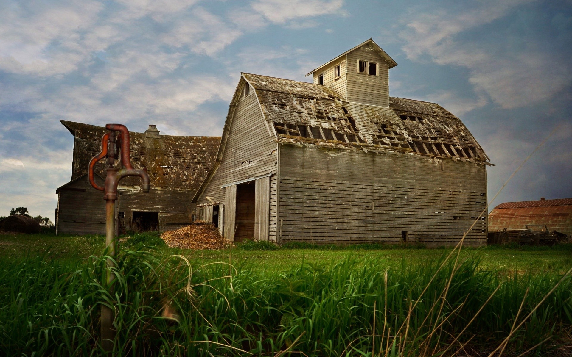 Yeşil çimlerdeki eski terk edilmiş ev
