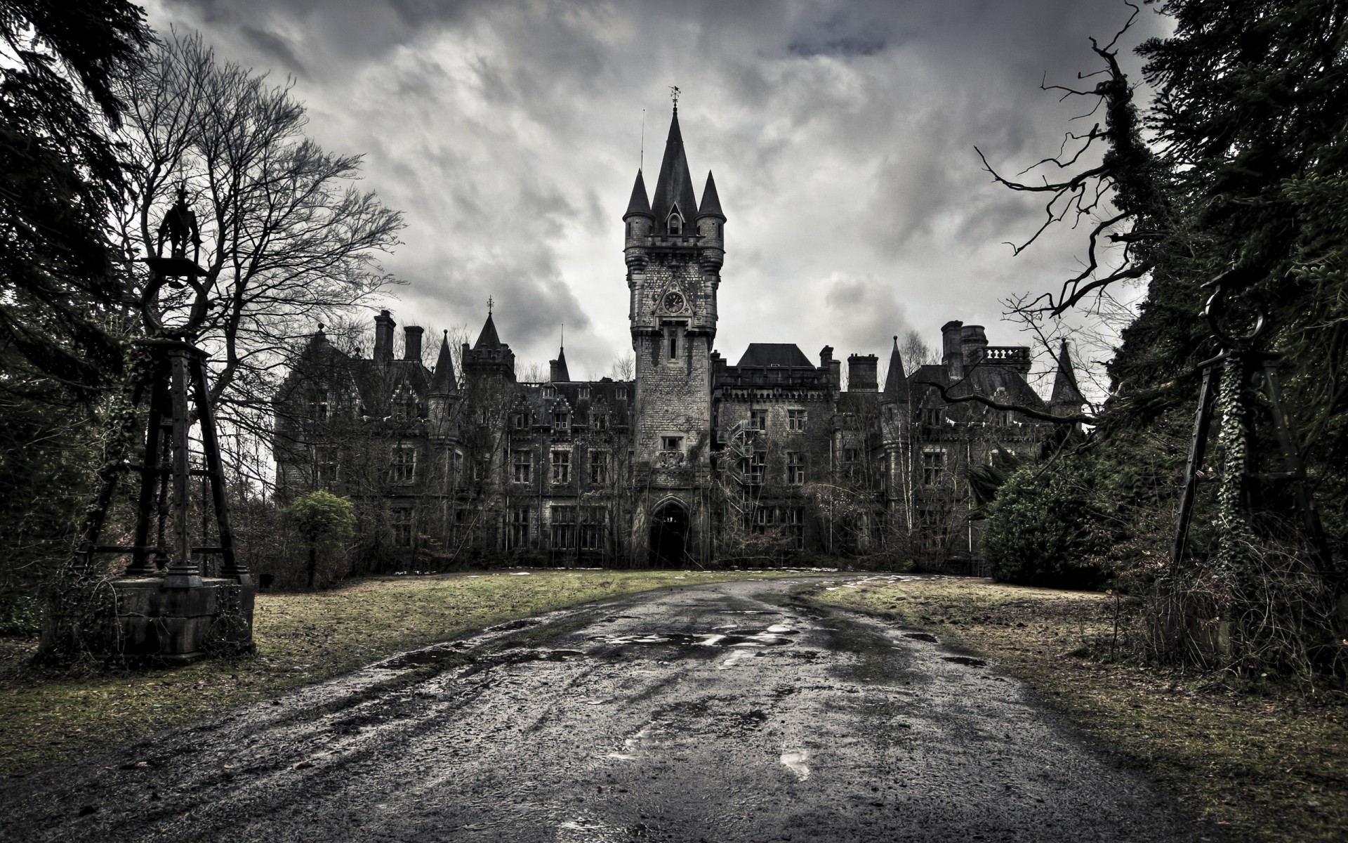 Eski bir kalenin siyah ve beyaz görüntüsü
