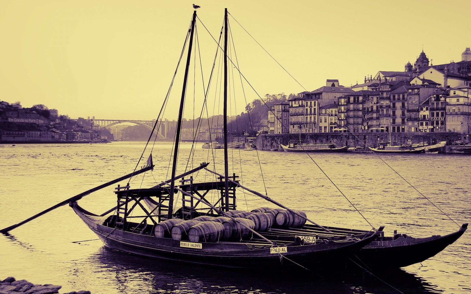 Şehrin arka planına karşı teknenin siyah ve beyaz tonlarında eski bir fotoğraf