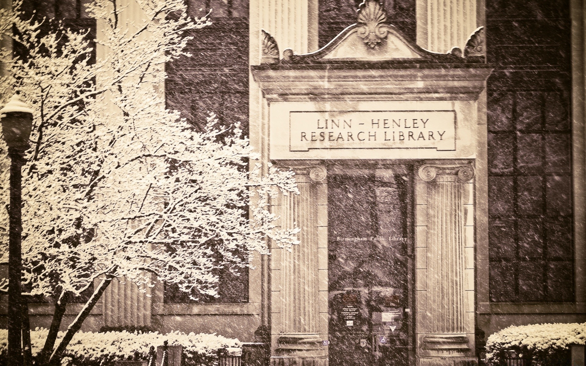 Çiçekli ağaç ve fenerle kütüphanenin eski fotoğrafı