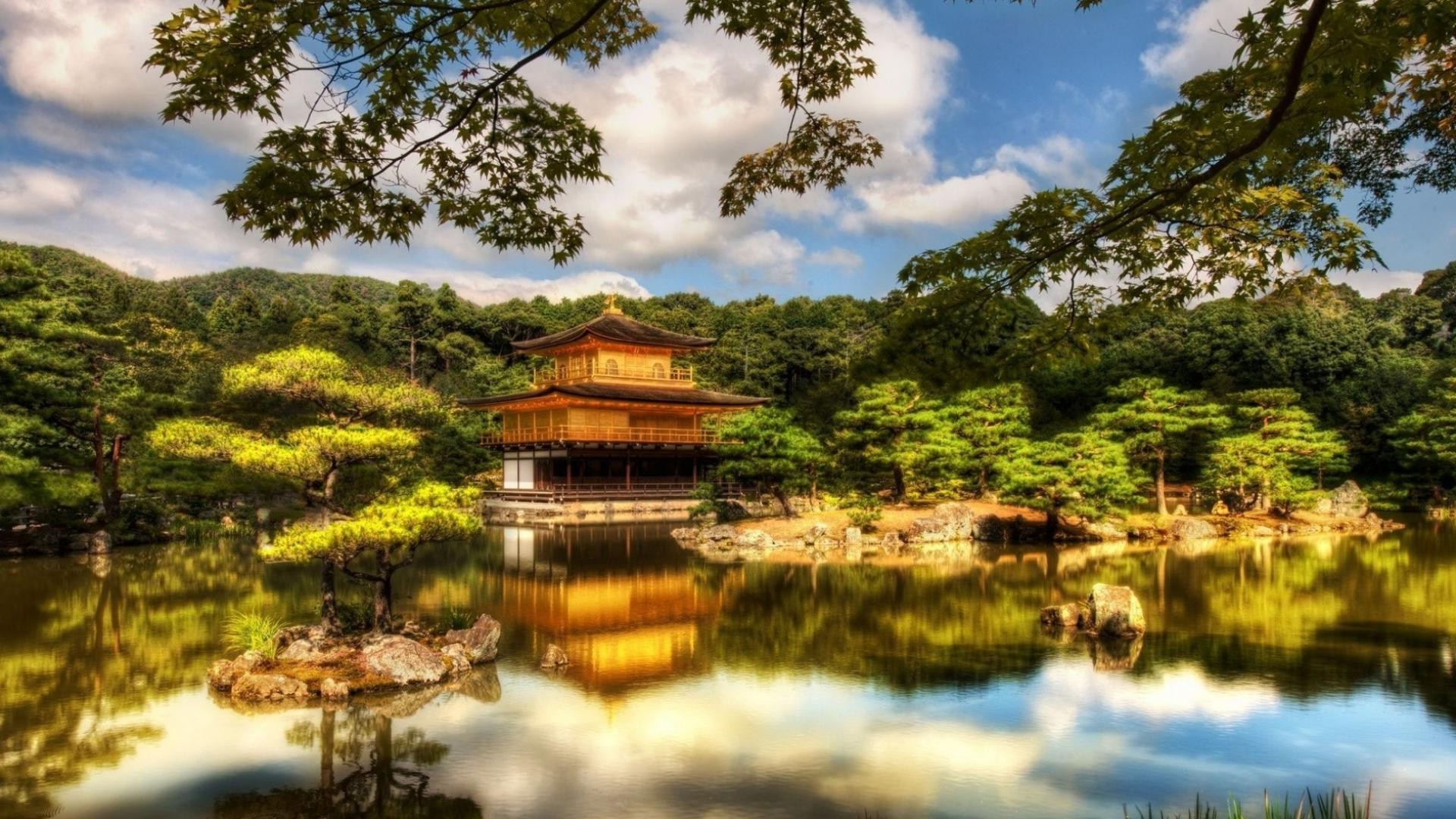 Ağaçların ortasında bir gölde Çin tarzı bir ev