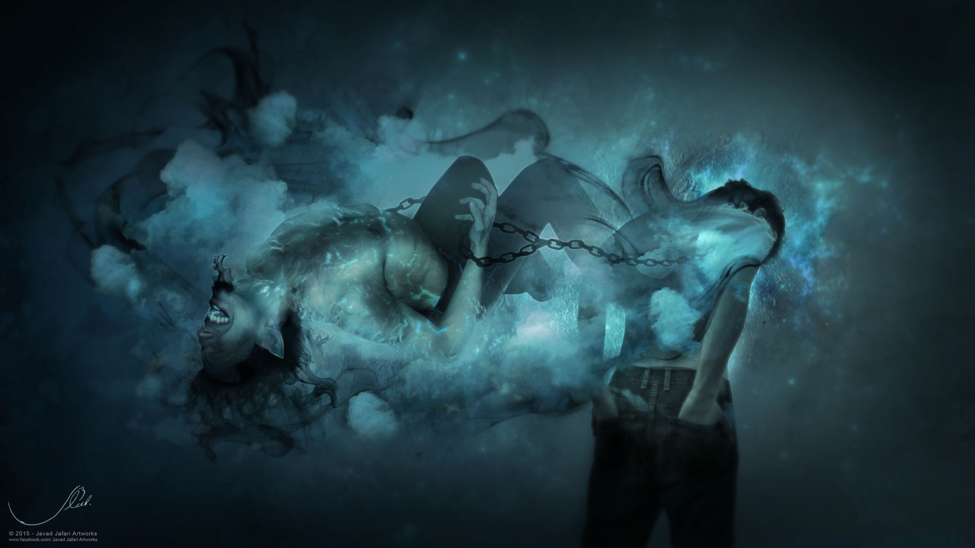 Mavi bulutsunun arka planına karşı zincirli adam