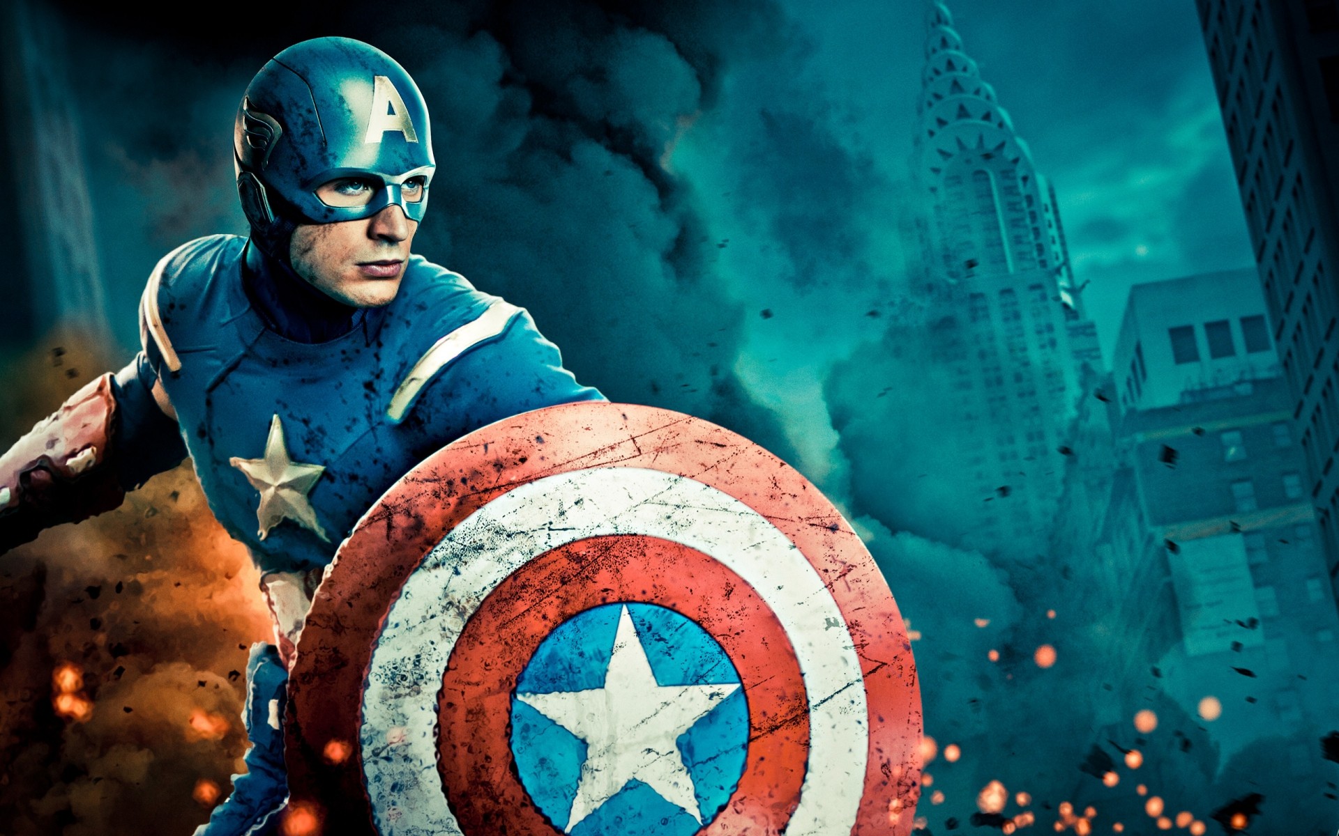 Kaptan Amerika yanan bir şehrin ortasında