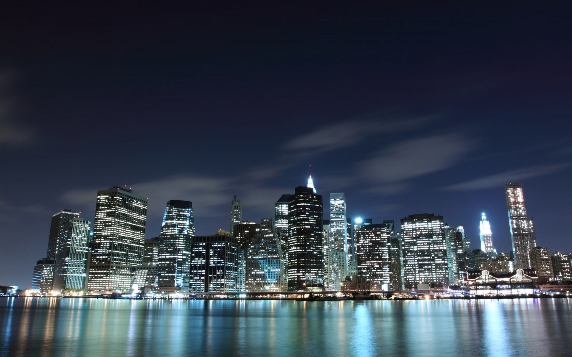 Şehir merkezindeki ışıklar ve nehirdeki yansıma