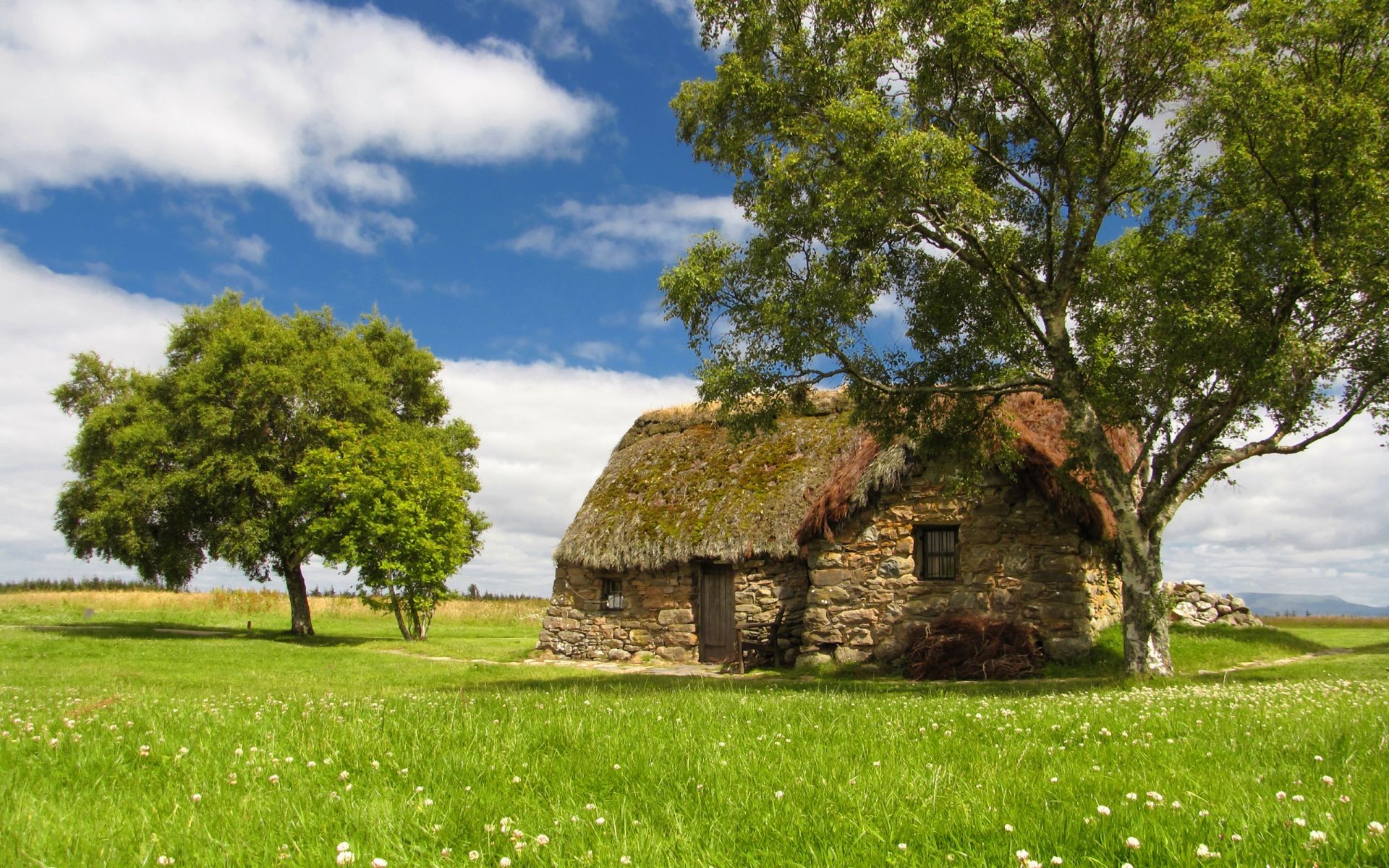 Yeşil çayırların ve bulutların arka planına karşı yazıtlı bir direk