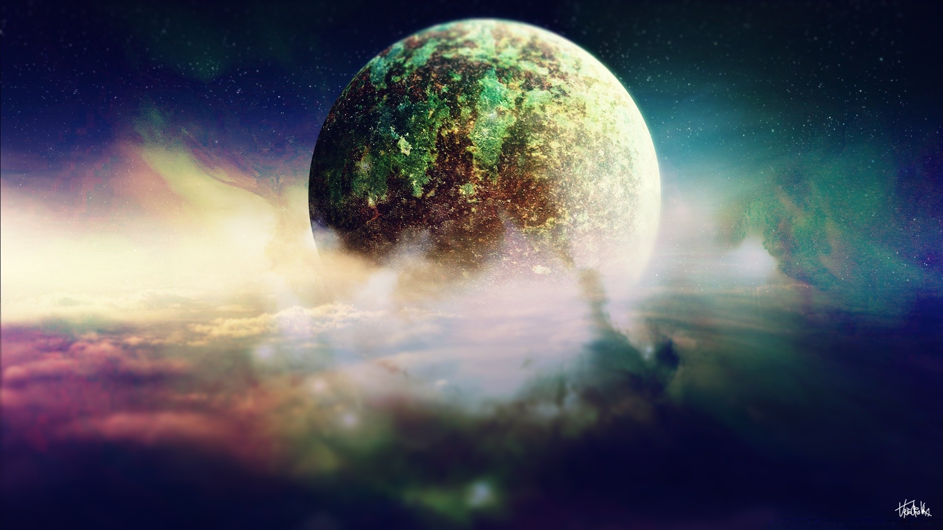 Ay ve karanlık bir arka plana karşı iki gezegen