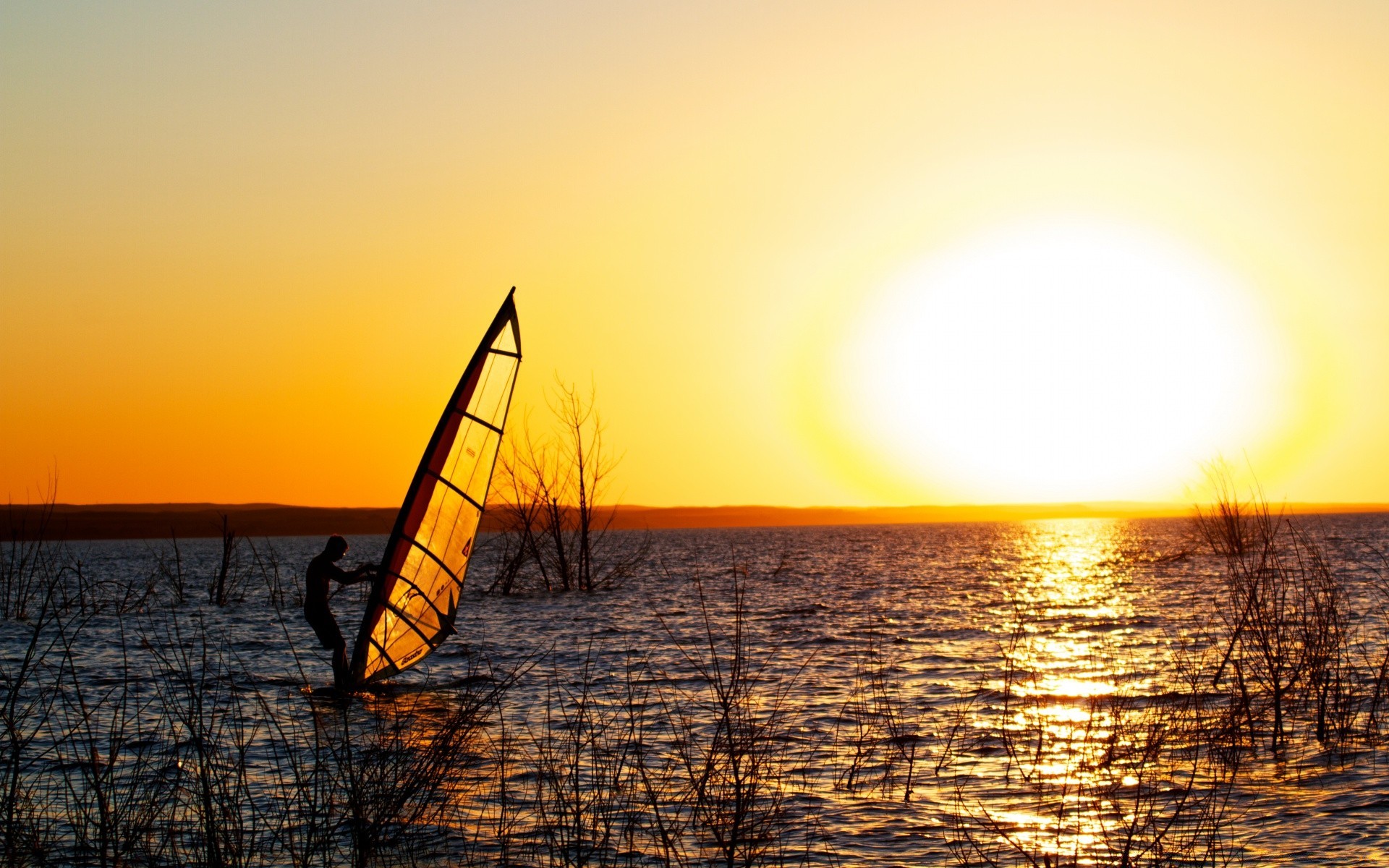 Gün batımında denizde sörfçü