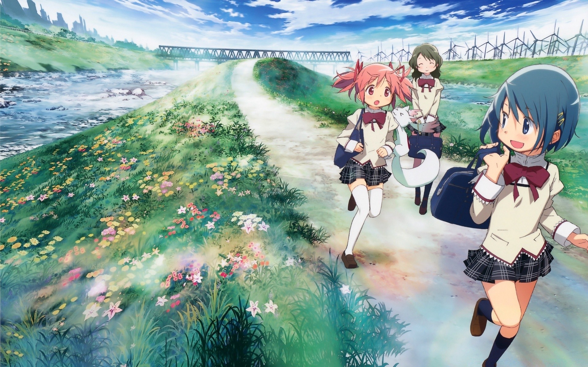 Üç küçük anime kız öğrenci kız pistte koşuyor
